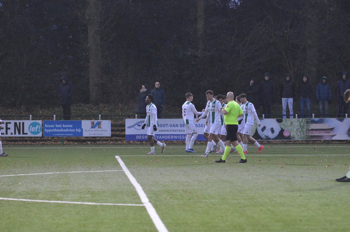 Het begin van de wedstrijd vanmiddag was voor de thuisploeg en men drukte FC Groningen terug op eigen helft. De Groningers probeerden er af en toe wel uit te komen maar de thuisploeg bleef het meest dreigend. In de 22ste minuut kwam men dan ook verdiend op voorsprong als Giorgio Ghiani door de defensie slalomt en de bal achter Jesse Tetteroo knalt, 1-0. Het talrijke publiek in Nijmegen dacht toen dat men de titel ging pakken want zoveel feest was er na de goal. Dat feest was snel afgelopen want men kon maar drie minuten genieten van de voorsprong want toen was het Mark Hoekstra die geheel vrij kwam voor doelman Martijn Overmans en de bal keurig langs de goalie speelde, 1-1.
