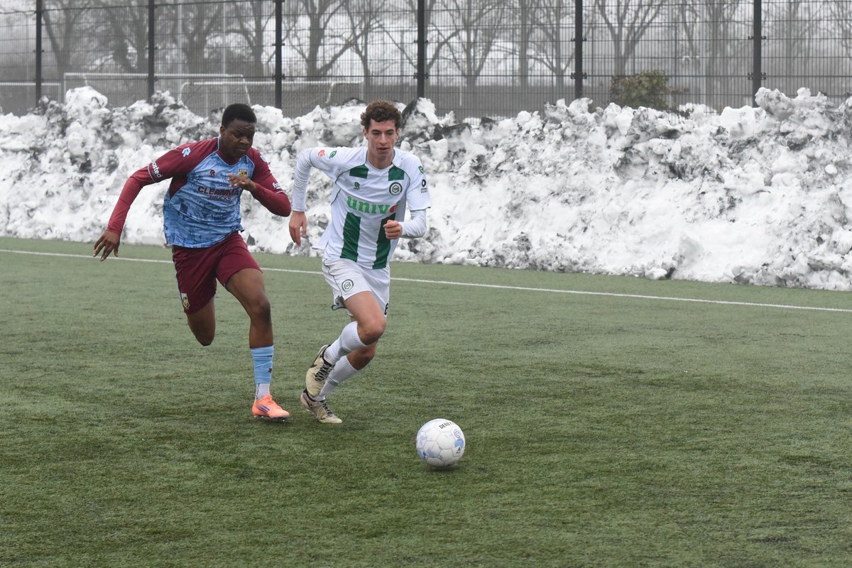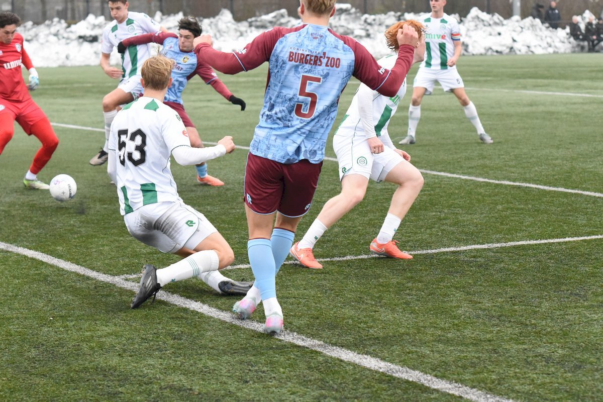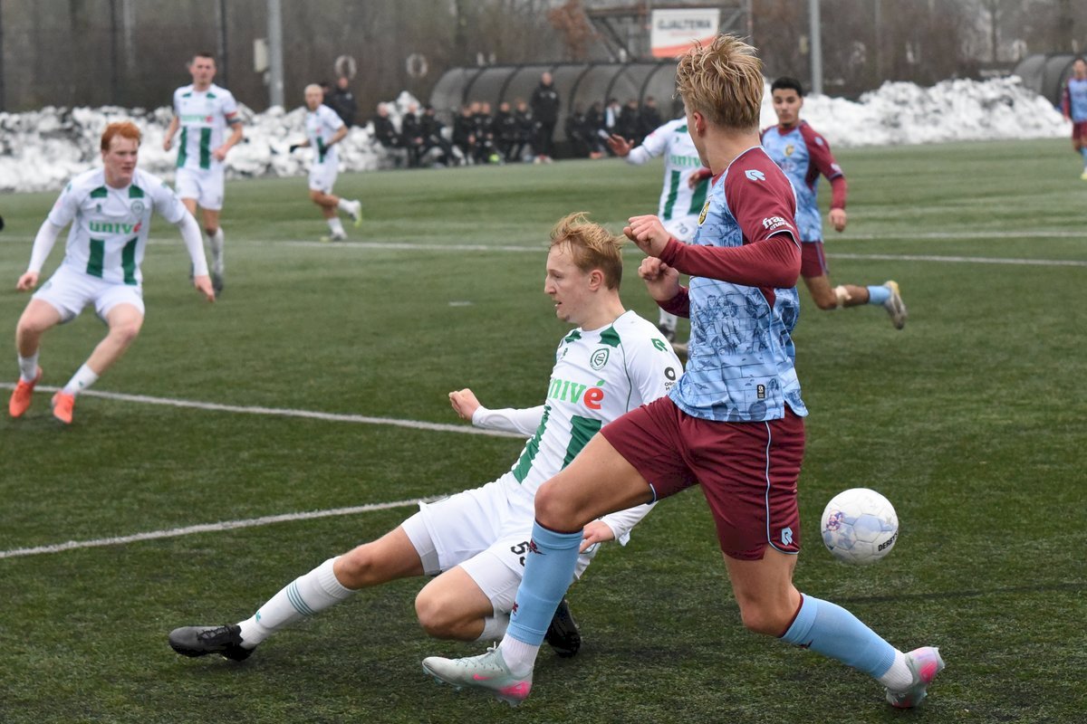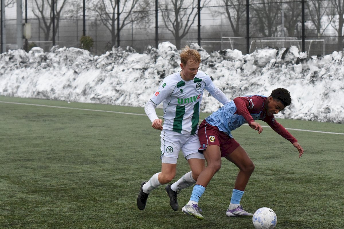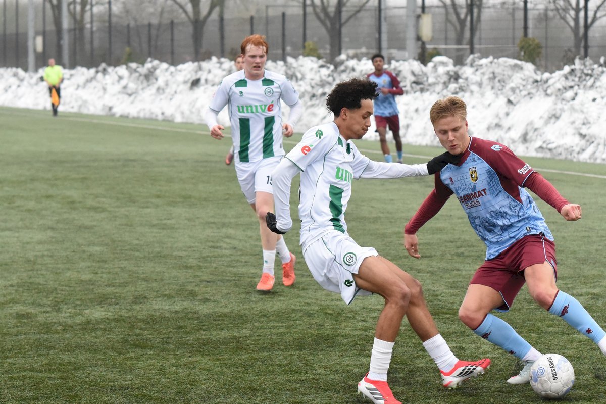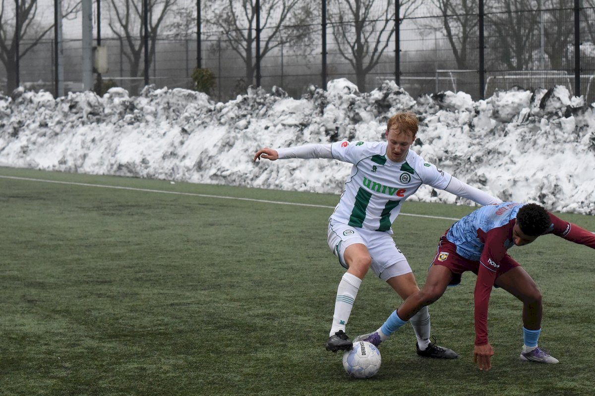 Na het behaalde kampioenschap in de najaarscompetitie en een verdiende rust traden de mannen van FC Groningen o21 vanmiddag op Corpus den Hoorn in de eerste wedstrijd van 2026 aan tegen Vitesse o21. Het leek wel of de wedstrijd in Oostenrijk of zo gespeeld werd want zulke hoge bergen sneeuw lagen er langs het veld. Het veld was daarentegen prima bespeelbaar.