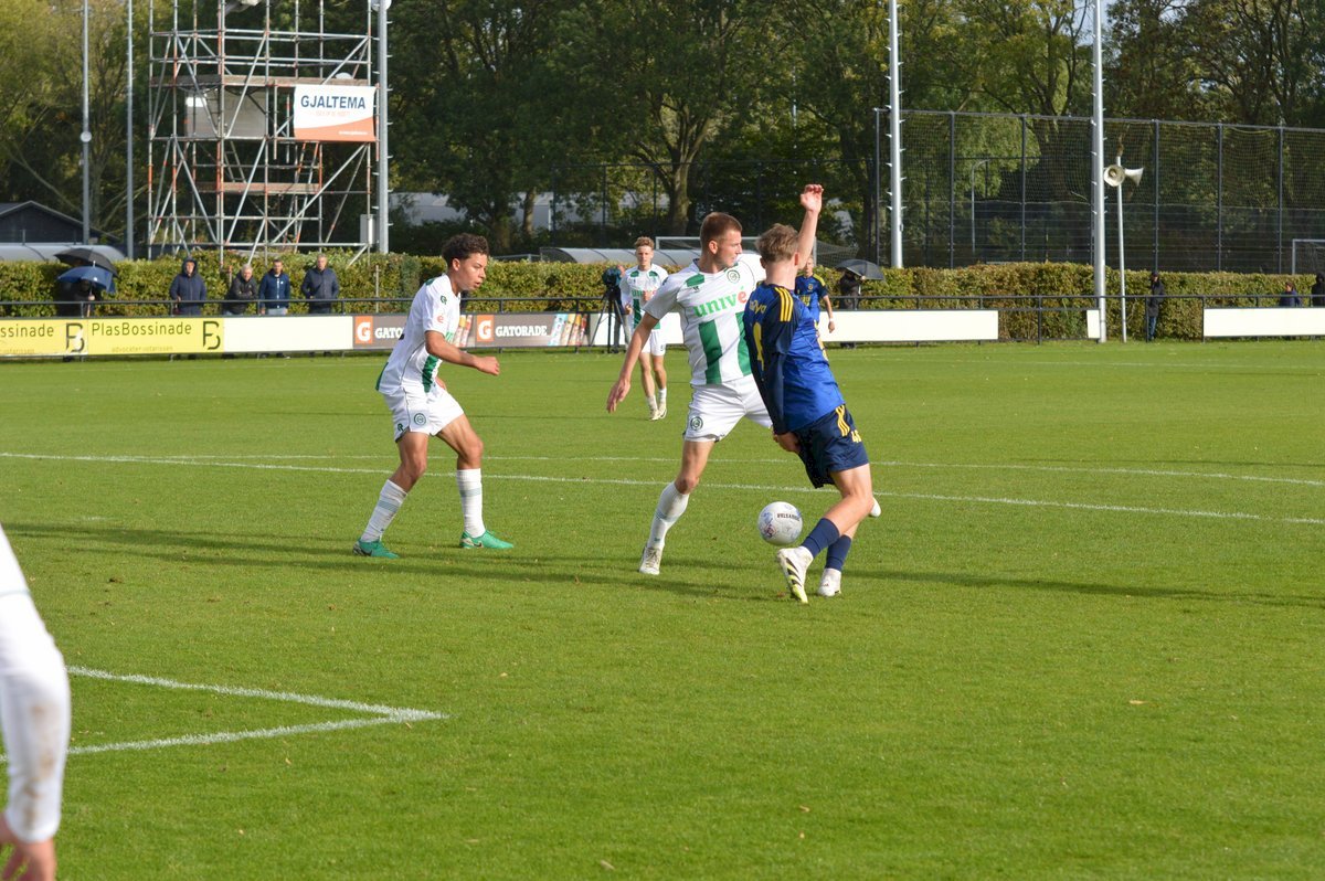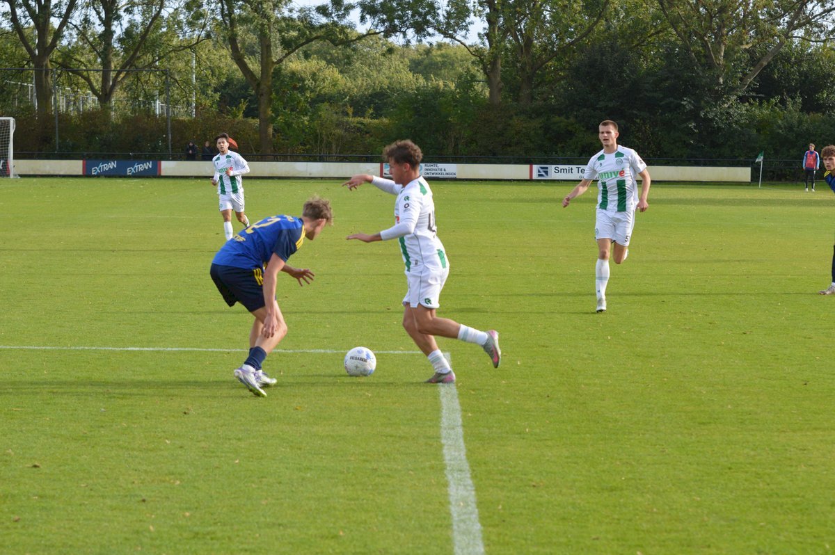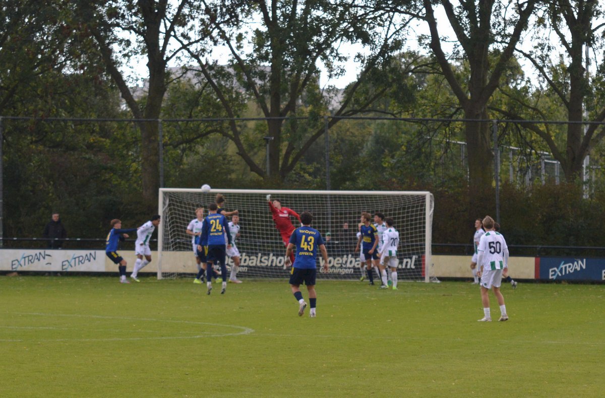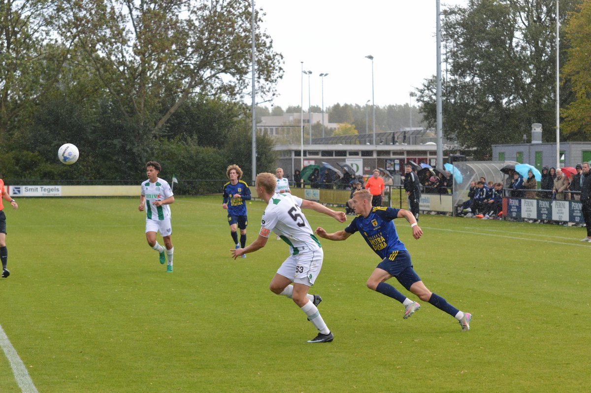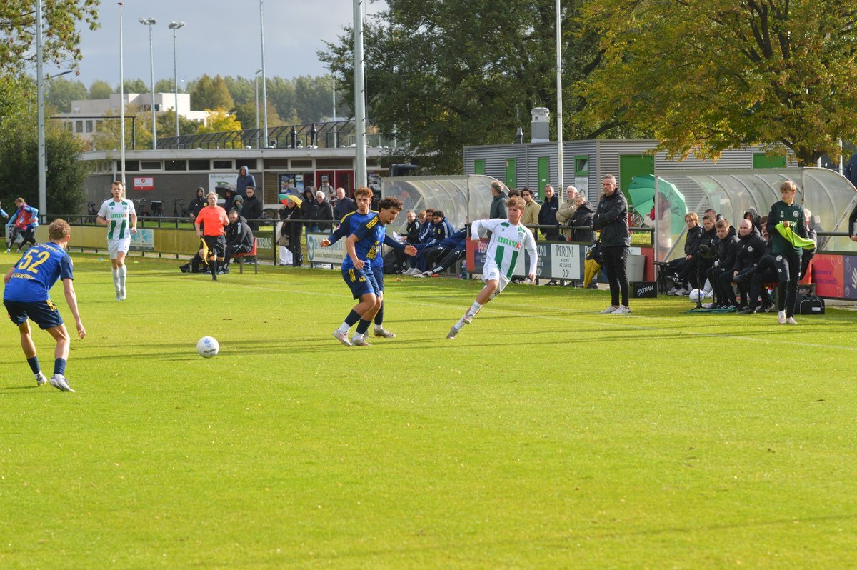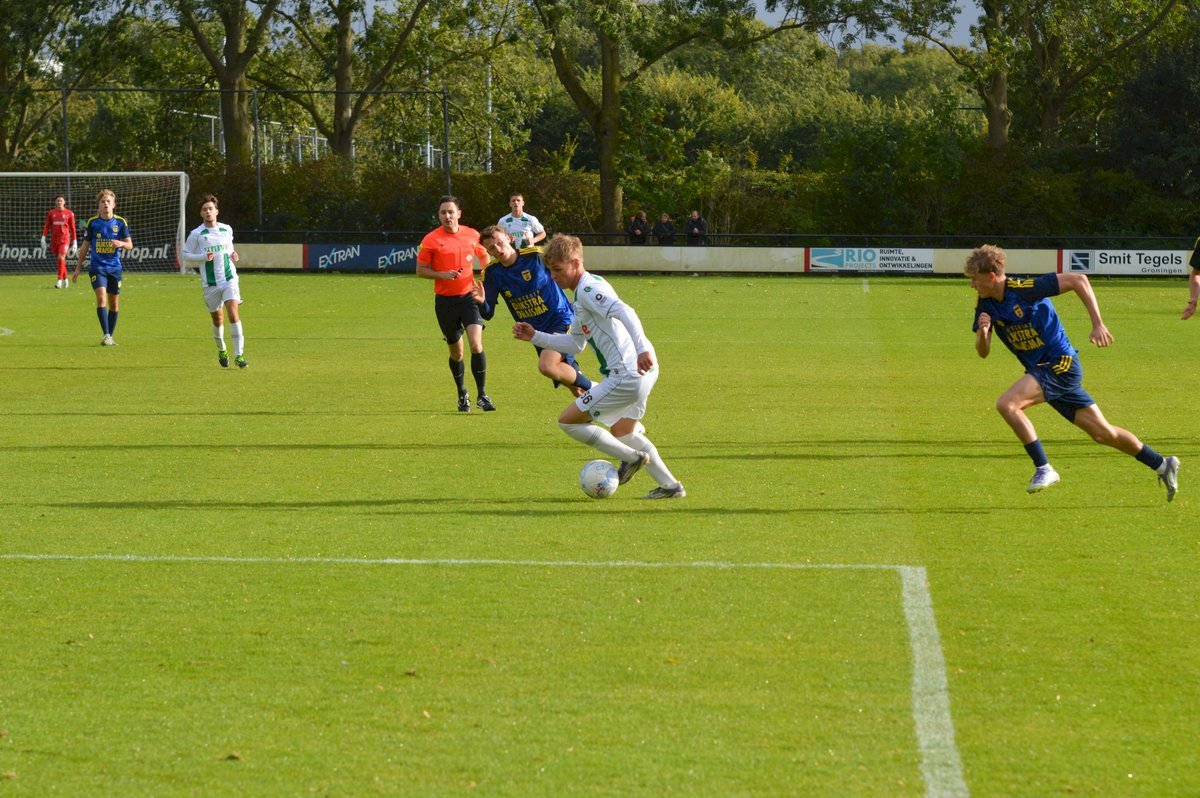 Vanmiddag op Sportpark Corpus den Hoorn in Groningen de topper in de Onder 21 Competitie Divisie 1 tussen de nummer één SC Cambuur o21 en de nummer twee FC Groningen o21. De Leeuwwarders hadden twee punten meer dan de Groningers dus bij winst van SC Cambuur liepen ze uit en bij winst van FC Groningen namen de Groningers de voorlopig koppositie over. FC Groningen was al vier wedstrijden op rijd ongeslagen dus het vertrouwen moest wel goed zijn, SC Cambuur was drie wedstrijden op rij ongeslagen. Onder toeziend oog van oud FC Groningen speler Remco Balk werd de wedstrijd gespeeld. Remco speelt tegenwoordig voor SC Cambuur en scoorde gisteravond nog twee keer tegen FC Emmen en bij Emmen scoorde Romano Postema weer. Ook FC Groningen trainer Dick Lukkien was aanwezig. We hebben Cambuur trainer Henk de Jong niet gezien. Omdat het de dag van de scheidsrechters was vandaag kreeg het arbitraal trio een bloemetje aangeboden van FC Groningen, een prachtige geste van de club.