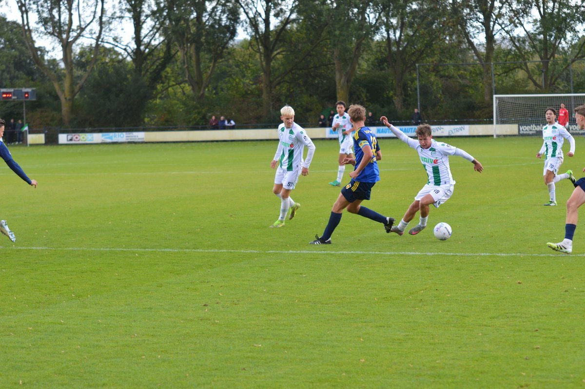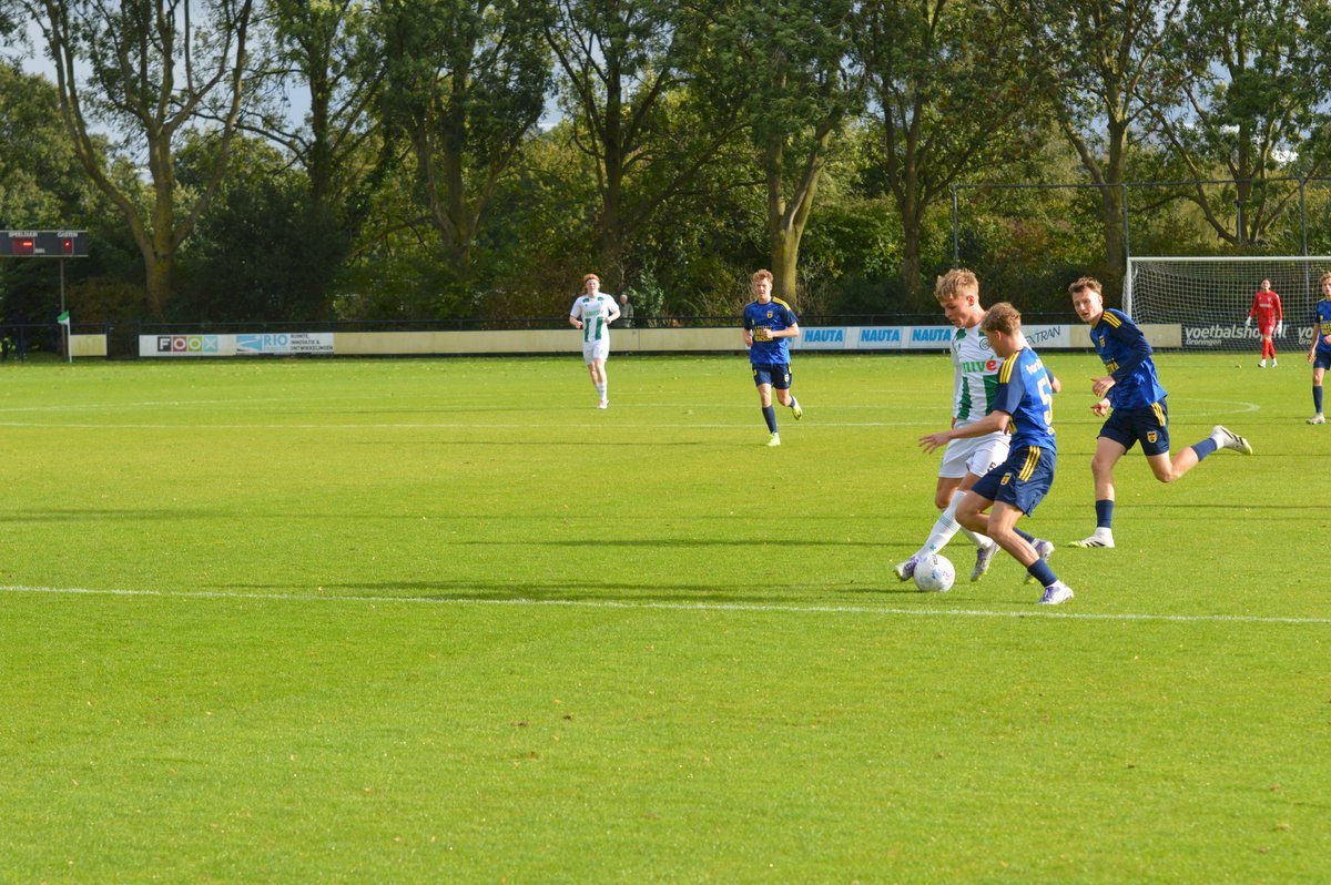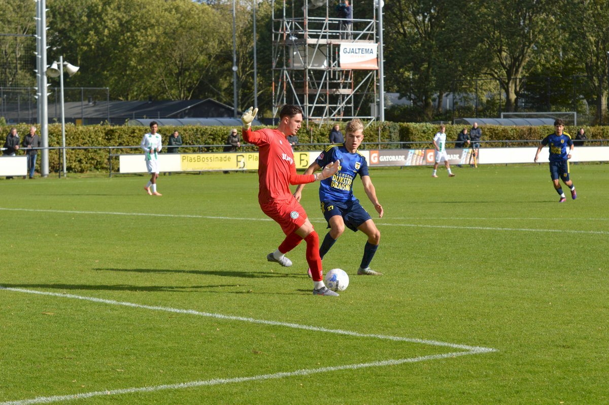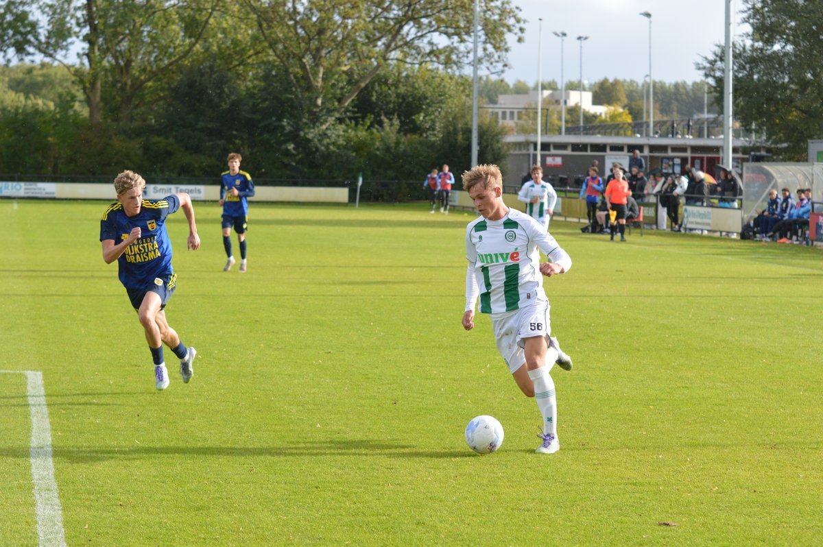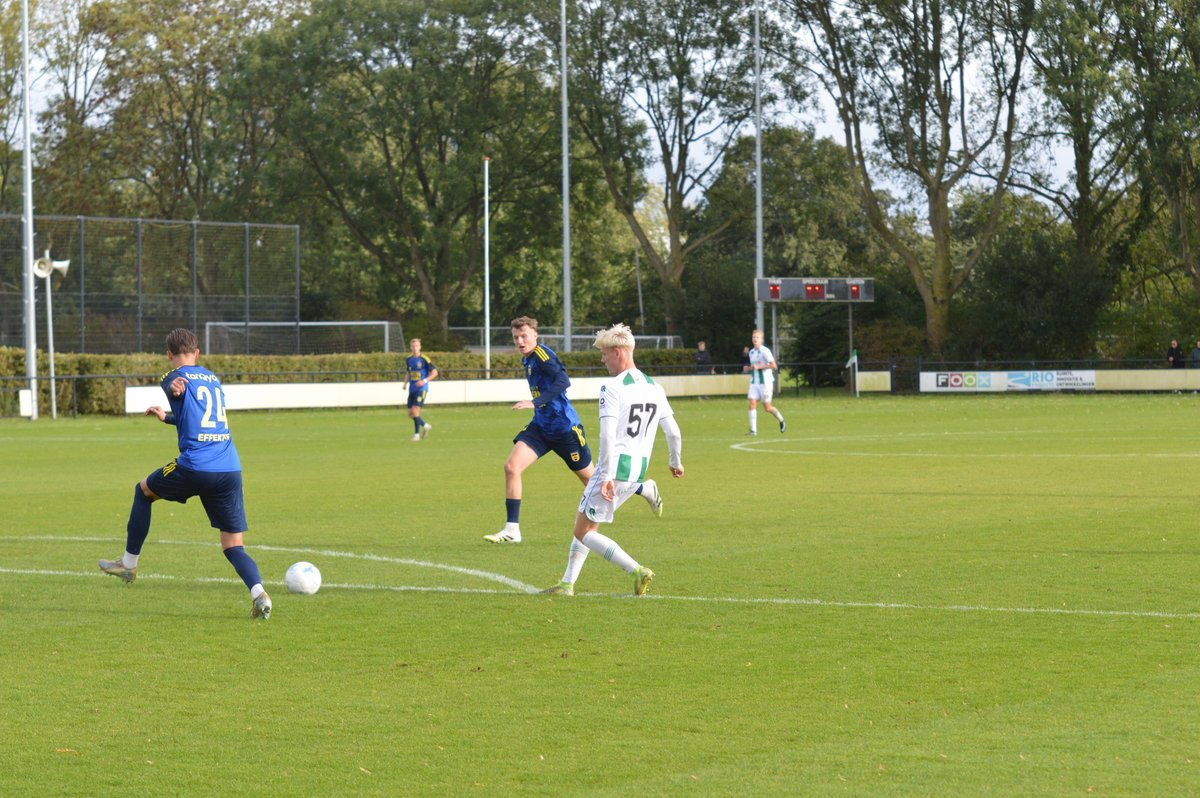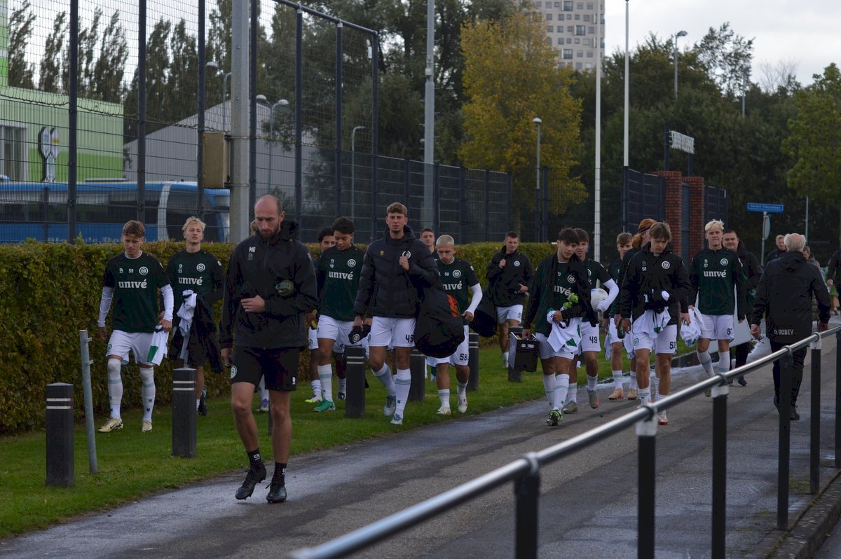 Vanmiddag op Sportpark Corpus den Hoorn in Groningen de topper in de Onder 21 Competitie Divisie 1 tussen de nummer één SC Cambuur o21 en de nummer twee FC Groningen o21. De Leeuwwarders hadden twee punten meer dan de Groningers dus bij winst van SC Cambuur liepen ze uit en bij winst van FC Groningen namen de Groningers de voorlopig koppositie over. FC Groningen was al vier wedstrijden op rijd ongeslagen dus het vertrouwen moest wel goed zijn, SC Cambuur was drie wedstrijden op rij ongeslagen. Onder toeziend oog van oud FC Groningen speler Remco Balk werd de wedstrijd gespeeld. Remco speelt tegenwoordig voor SC Cambuur en scoorde gisteravond nog twee keer tegen FC Emmen en bij Emmen scoorde Romano Postema weer. Ook FC Groningen trainer Dick Lukkien was aanwezig. We hebben Cambuur trainer Henk de Jong niet gezien. Omdat het de dag van de scheidsrechters was vandaag kreeg het arbitraal trio een bloemetje aangeboden van FC Groningen, een prachtige geste van de club.