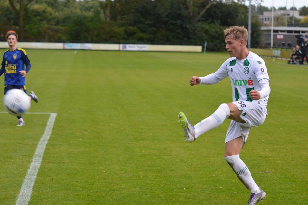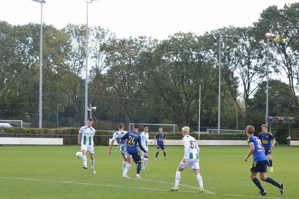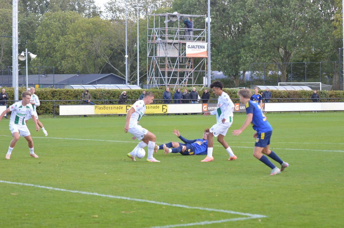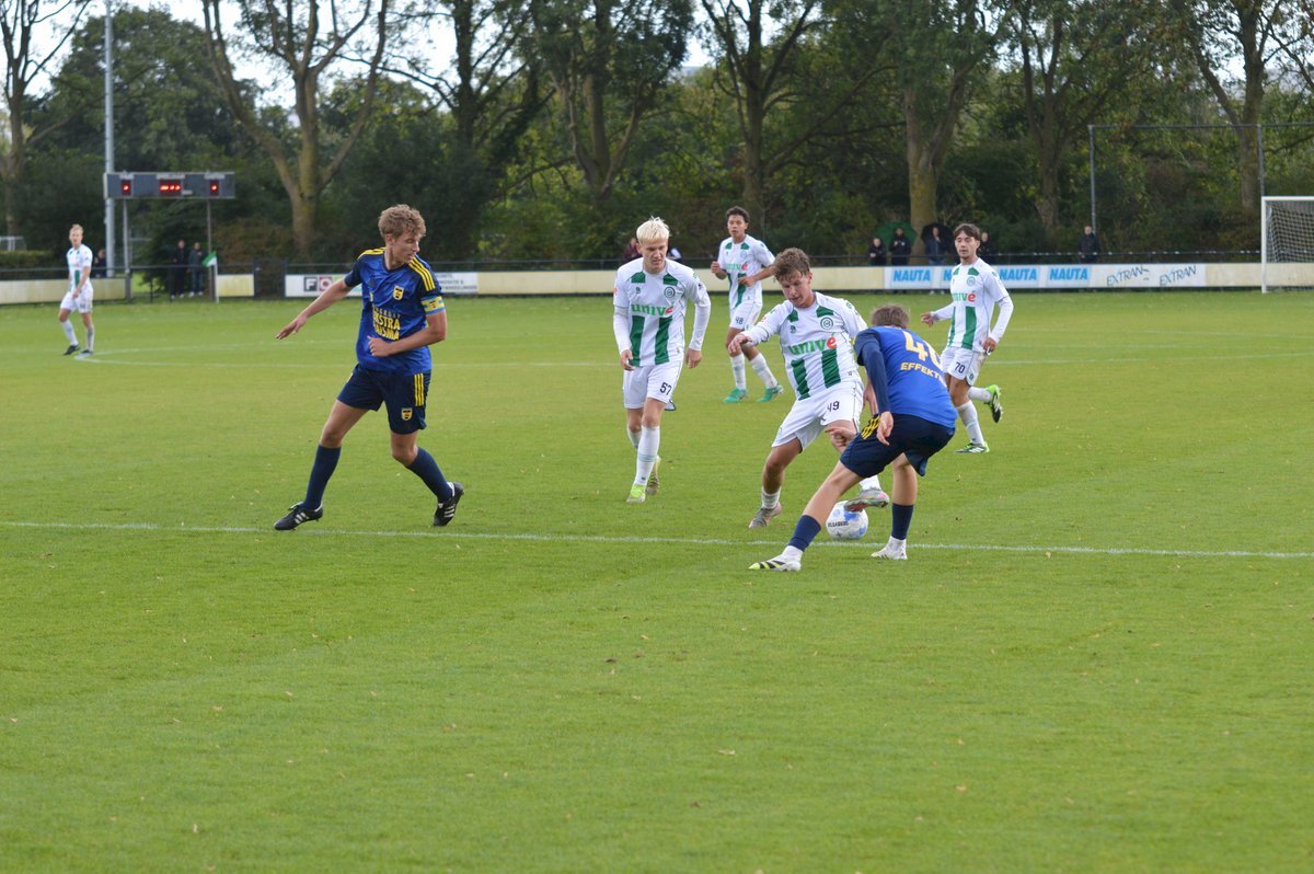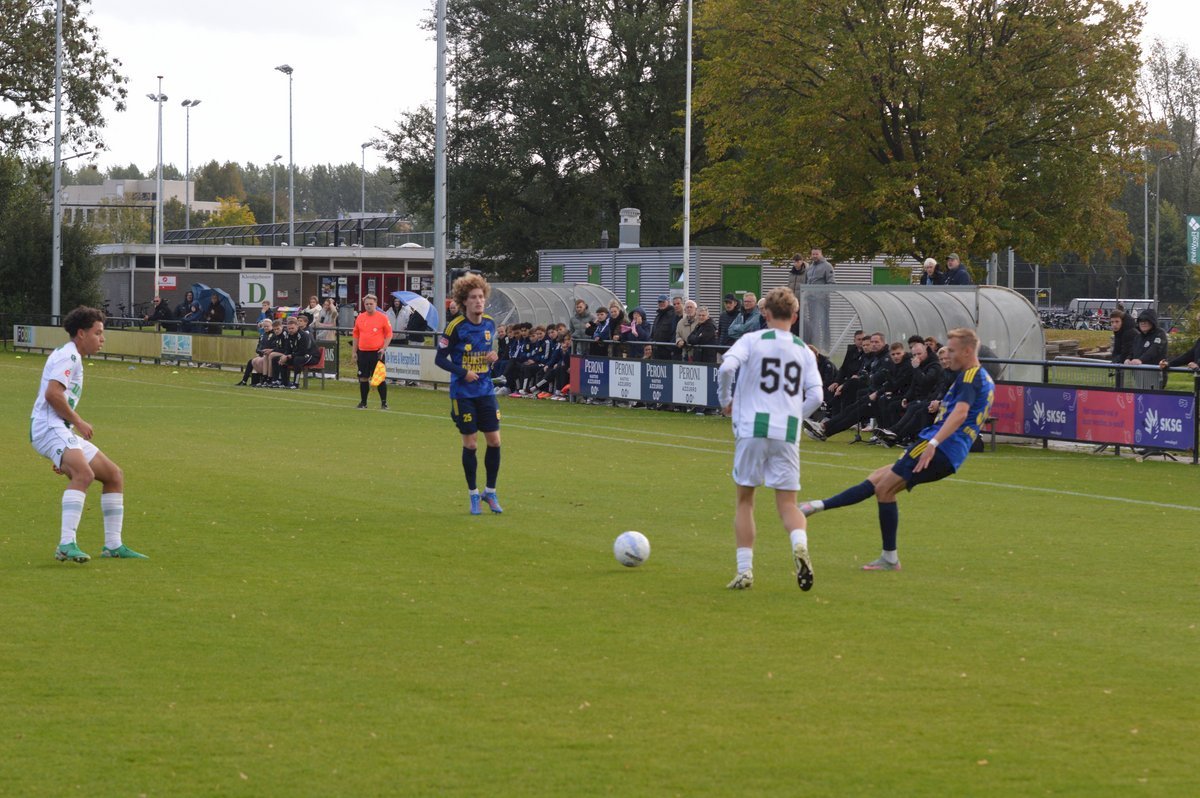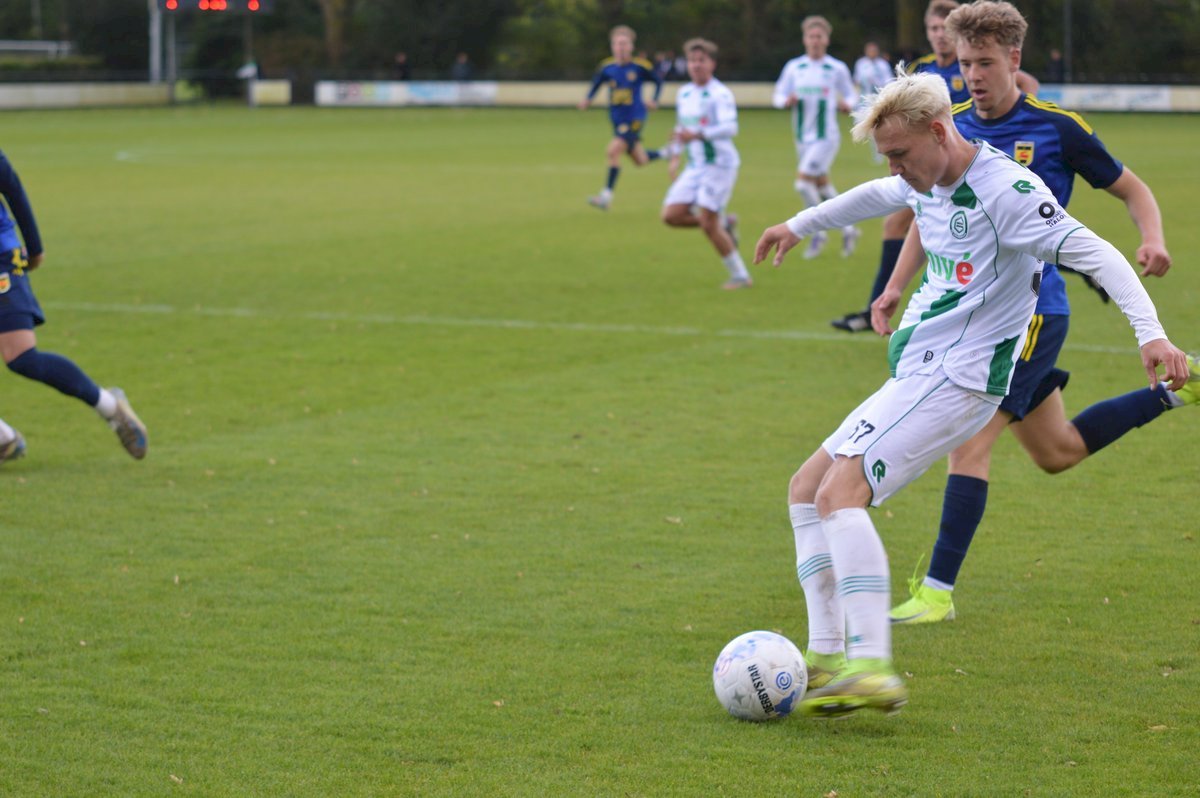 Vanmiddag op Sportpark Corpus den Hoorn in Groningen de topper in de Onder 21 Competitie Divisie 1 tussen de nummer één SC Cambuur o21 en de nummer twee FC Groningen o21. De Leeuwwarders hadden twee punten meer dan de Groningers dus bij winst van SC Cambuur liepen ze uit en bij winst van FC Groningen namen de Groningers de voorlopig koppositie over. FC Groningen was al vier wedstrijden op rijd ongeslagen dus het vertrouwen moest wel goed zijn, SC Cambuur was drie wedstrijden op rij ongeslagen. Onder toeziend oog van oud FC Groningen speler Remco Balk werd de wedstrijd gespeeld. Remco speelt tegenwoordig voor SC Cambuur en scoorde gisteravond nog twee keer tegen FC Emmen en bij Emmen scoorde Romano Postema weer. Ook FC Groningen trainer Dick Lukkien was aanwezig. We hebben Cambuur trainer Henk de Jong niet gezien. Omdat het de dag van de scheidsrechters was vandaag kreeg het arbitraal trio een bloemetje aangeboden van FC Groningen, een prachtige geste van de club.