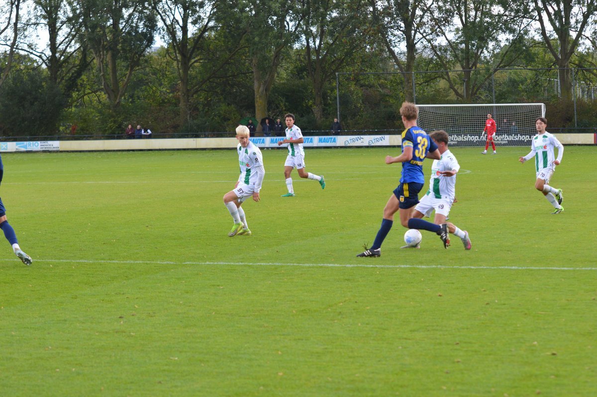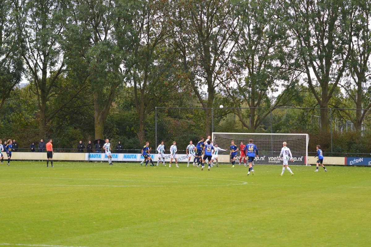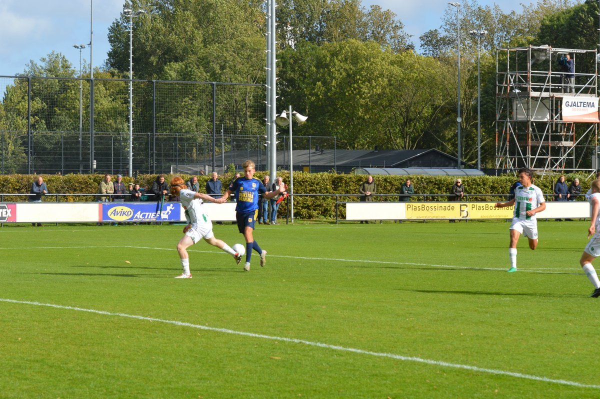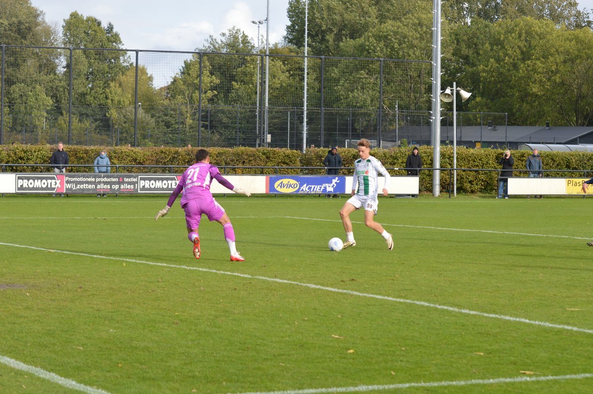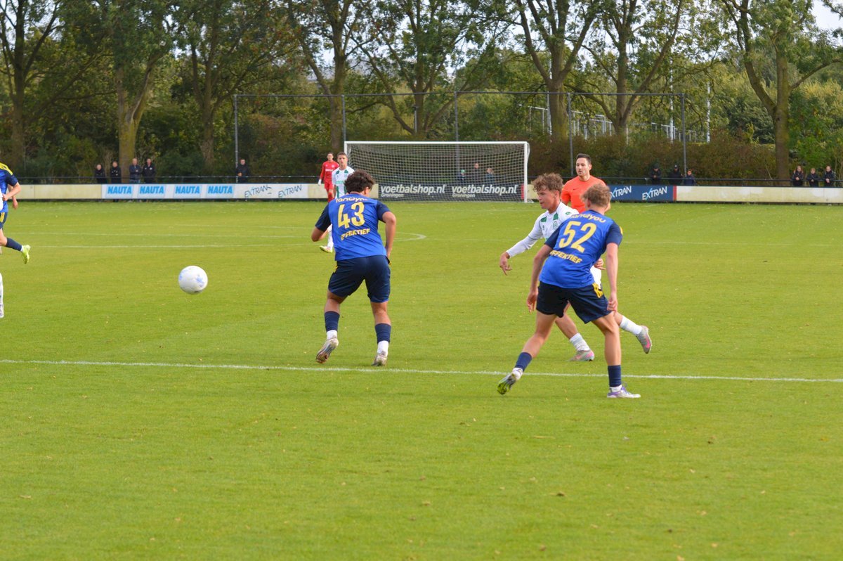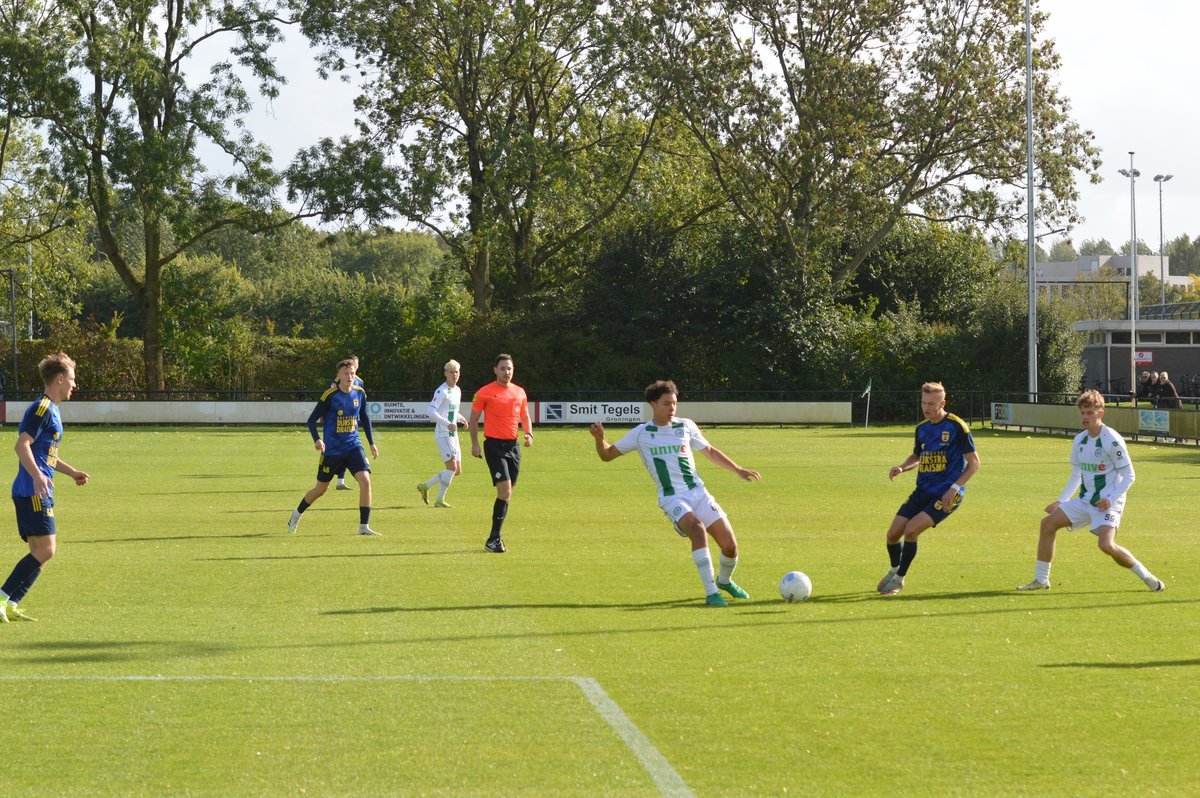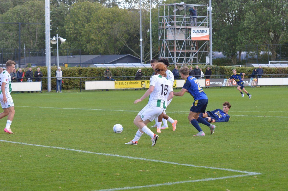 Vanmiddag op Sportpark Corpus den Hoorn in Groningen de topper in de Onder 21 Competitie Divisie 1 tussen de nummer één SC Cambuur o21 en de nummer twee FC Groningen o21. De Leeuwwarders hadden twee punten meer dan de Groningers dus bij winst van SC Cambuur liepen ze uit en bij winst van FC Groningen namen de Groningers de voorlopig koppositie over. FC Groningen was al vier wedstrijden op rijd ongeslagen dus het vertrouwen moest wel goed zijn, SC Cambuur was drie wedstrijden op rij ongeslagen. Onder toeziend oog van oud FC Groningen speler Remco Balk werd de wedstrijd gespeeld. Remco speelt tegenwoordig voor SC Cambuur en scoorde gisteravond nog twee keer tegen FC Emmen en bij Emmen scoorde Romano Postema weer. Ook FC Groningen trainer Dick Lukkien was aanwezig. We hebben Cambuur trainer Henk de Jong niet gezien. Omdat het de dag van de scheidsrechters was vandaag kreeg het arbitraal trio een bloemetje aangeboden van FC Groningen, een prachtige geste van de club.