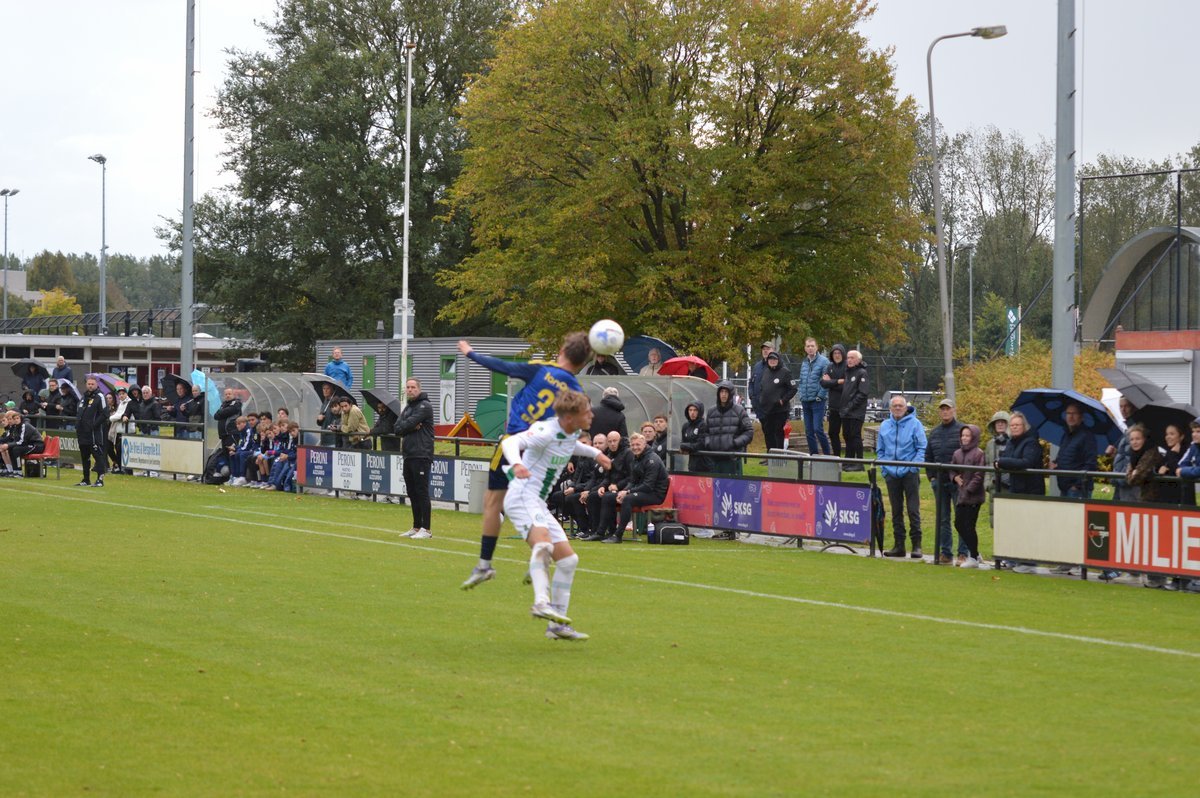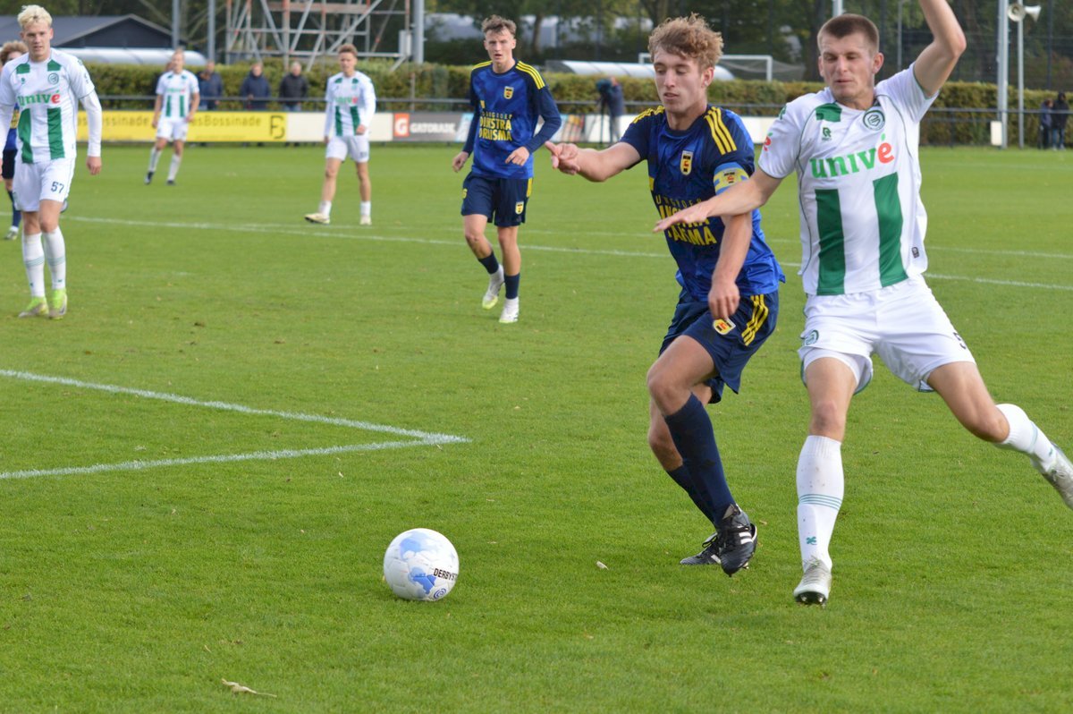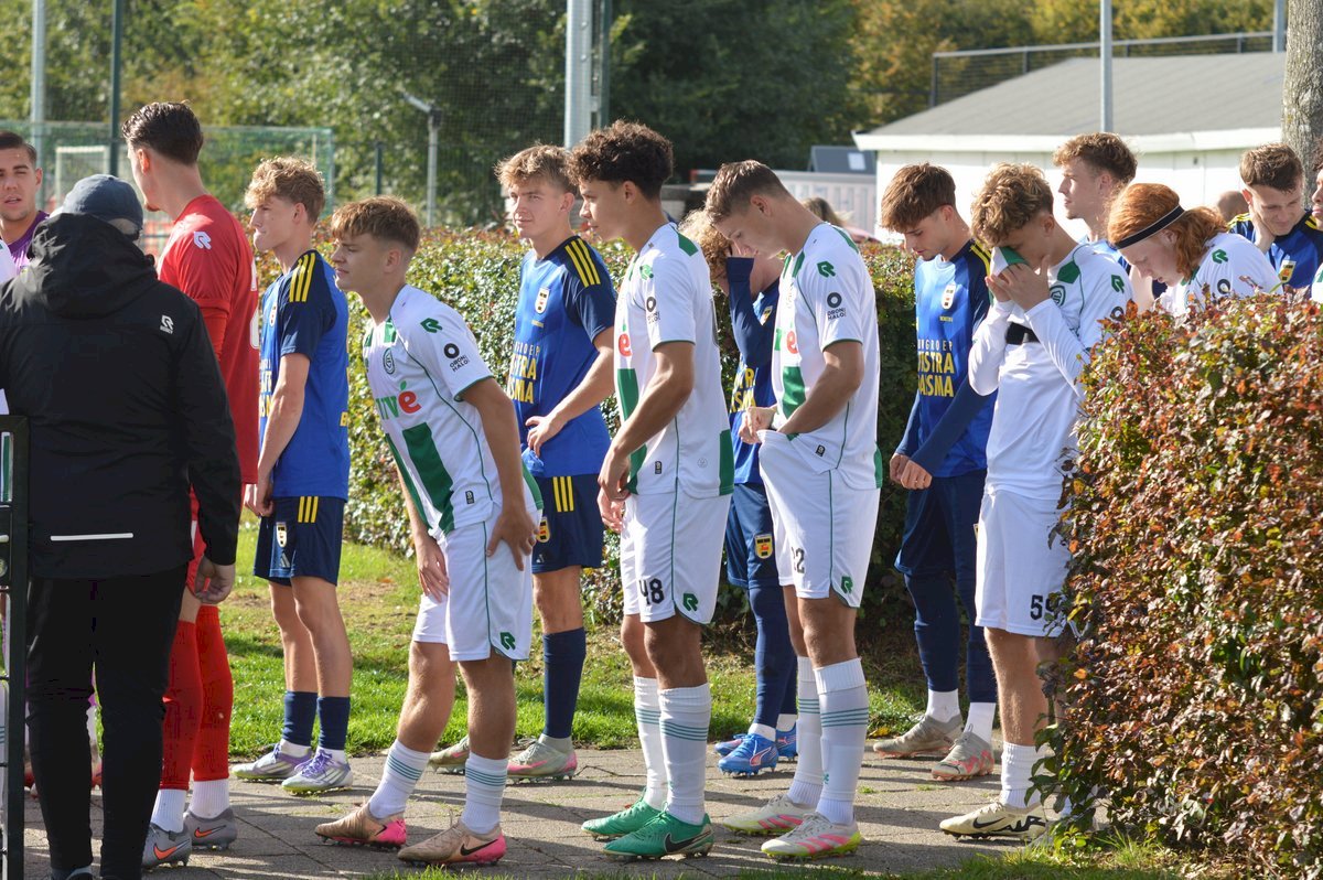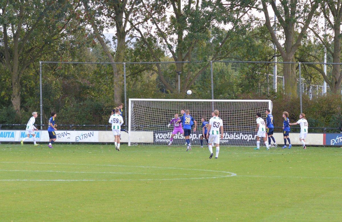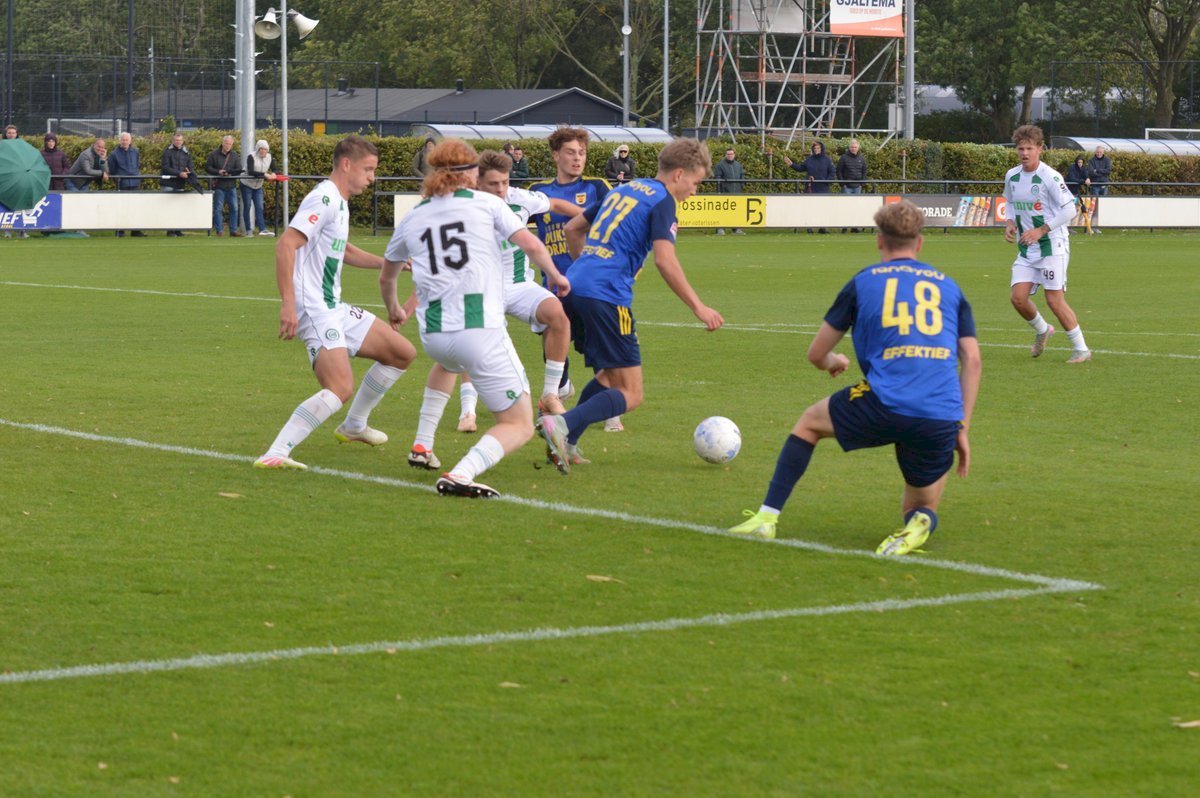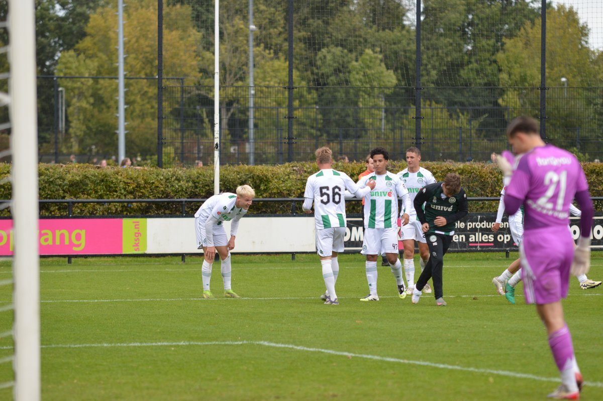 Vanmiddag op Sportpark Corpus den Hoorn in Groningen de topper in de Onder 21 Competitie Divisie 1 tussen de nummer één SC Cambuur o21 en de nummer twee FC Groningen o21. De Leeuwwarders hadden twee punten meer dan de Groningers dus bij winst van SC Cambuur liepen ze uit en bij winst van FC Groningen namen de Groningers de voorlopig koppositie over. FC Groningen was al vier wedstrijden op rijd ongeslagen dus het vertrouwen moest wel goed zijn, SC Cambuur was drie wedstrijden op rij ongeslagen. Onder toeziend oog van oud FC Groningen speler Remco Balk werd de wedstrijd gespeeld. Remco speelt tegenwoordig voor SC Cambuur en scoorde gisteravond nog twee keer tegen FC Emmen en bij Emmen scoorde Romano Postema weer. Ook FC Groningen trainer Dick Lukkien was aanwezig. We hebben Cambuur trainer Henk de Jong niet gezien. Omdat het de dag van de scheidsrechters was vandaag kreeg het arbitraal trio een bloemetje aangeboden van FC Groningen, een prachtige geste van de club.