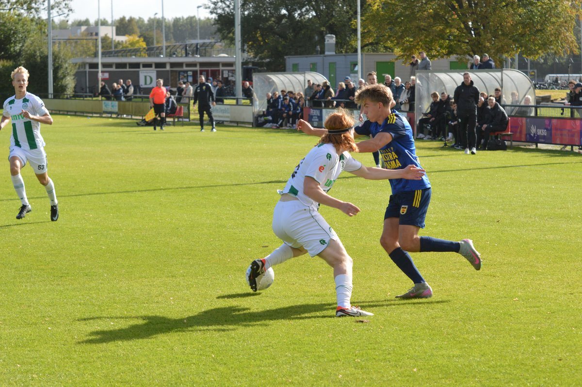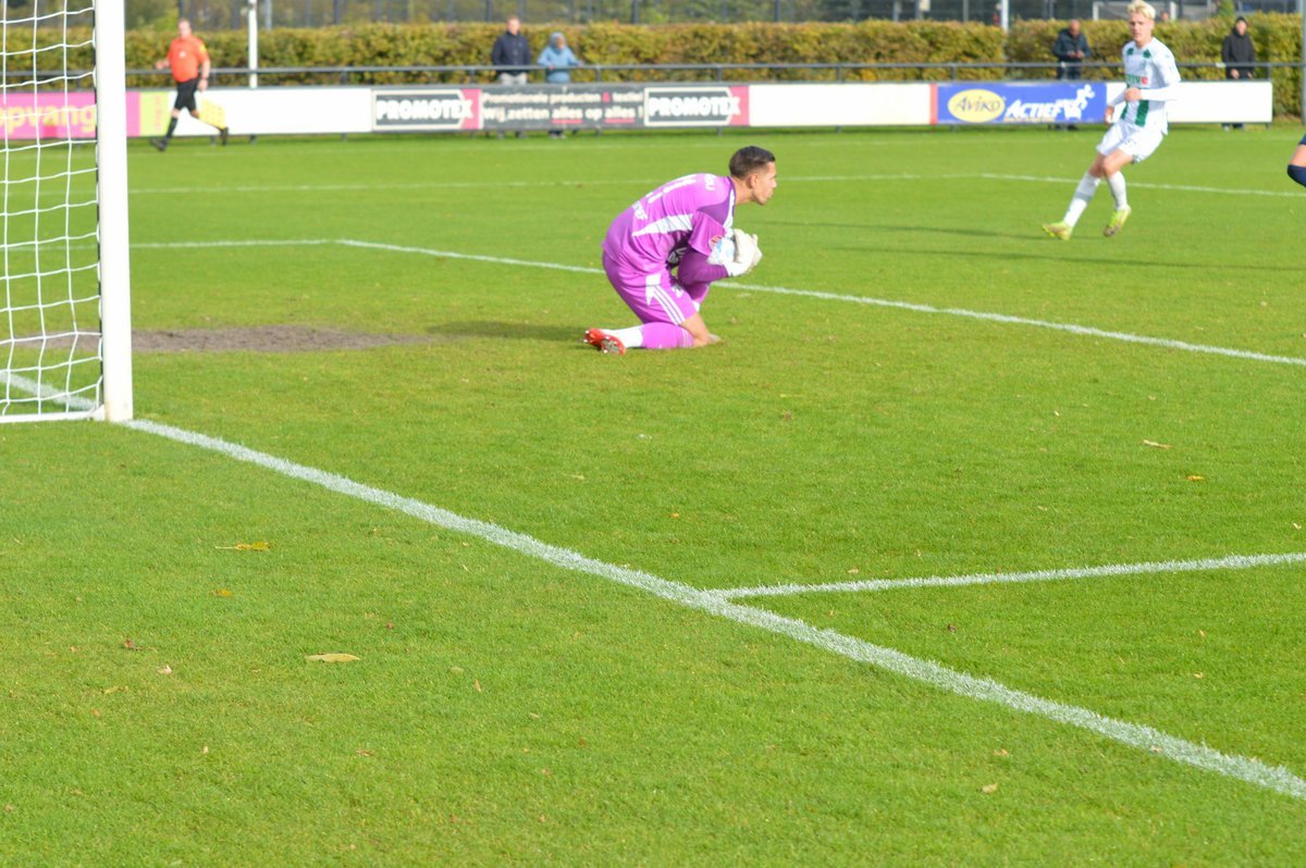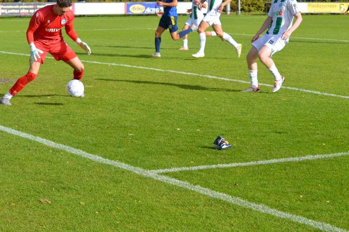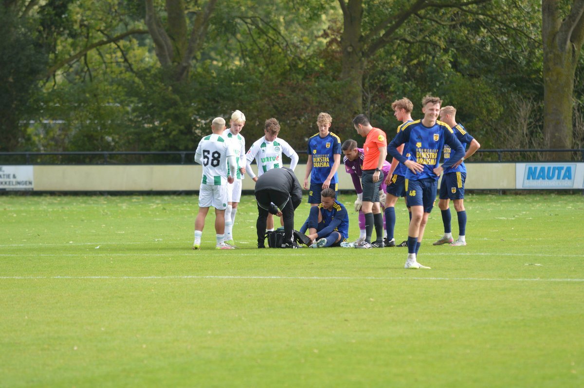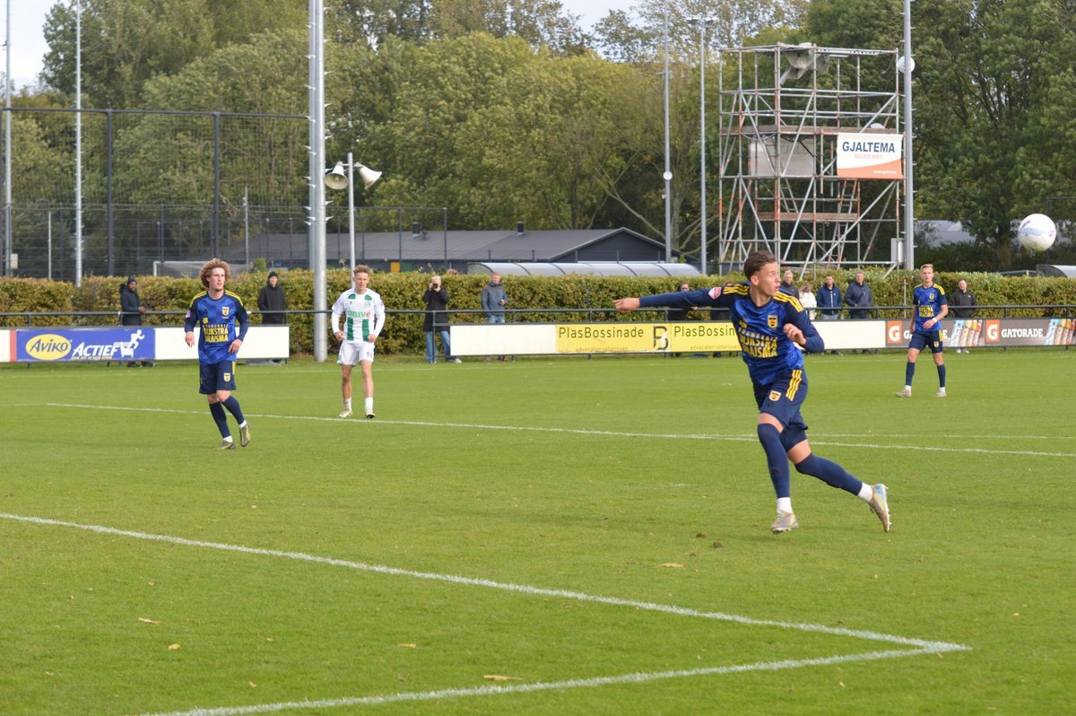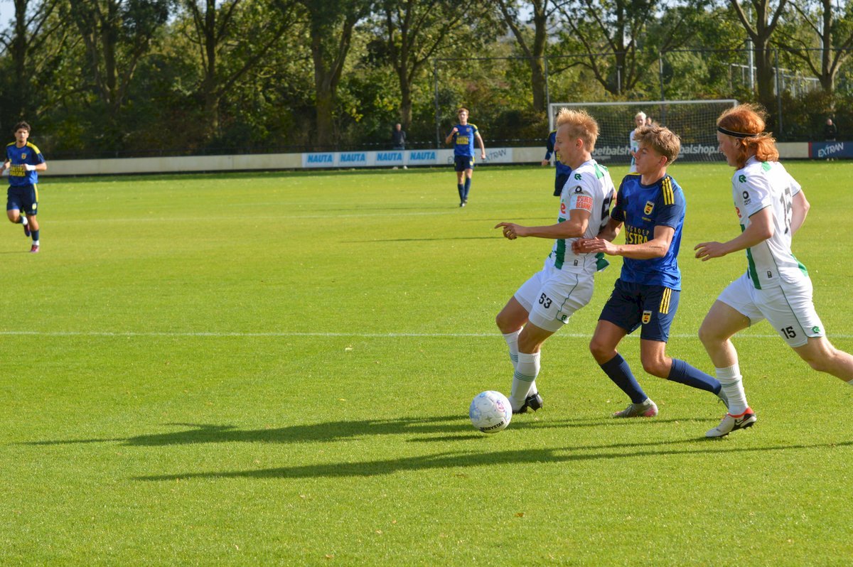 Vanmiddag op Sportpark Corpus den Hoorn in Groningen de topper in de Onder 21 Competitie Divisie 1 tussen de nummer één SC Cambuur o21 en de nummer twee FC Groningen o21. De Leeuwwarders hadden twee punten meer dan de Groningers dus bij winst van SC Cambuur liepen ze uit en bij winst van FC Groningen namen de Groningers de voorlopig koppositie over. FC Groningen was al vier wedstrijden op rijd ongeslagen dus het vertrouwen moest wel goed zijn, SC Cambuur was drie wedstrijden op rij ongeslagen. Onder toeziend oog van oud FC Groningen speler Remco Balk werd de wedstrijd gespeeld. Remco speelt tegenwoordig voor SC Cambuur en scoorde gisteravond nog twee keer tegen FC Emmen en bij Emmen scoorde Romano Postema weer. Ook FC Groningen trainer Dick Lukkien was aanwezig. We hebben Cambuur trainer Henk de Jong niet gezien. Omdat het de dag van de scheidsrechters was vandaag kreeg het arbitraal trio een bloemetje aangeboden van FC Groningen, een prachtige geste van de club.