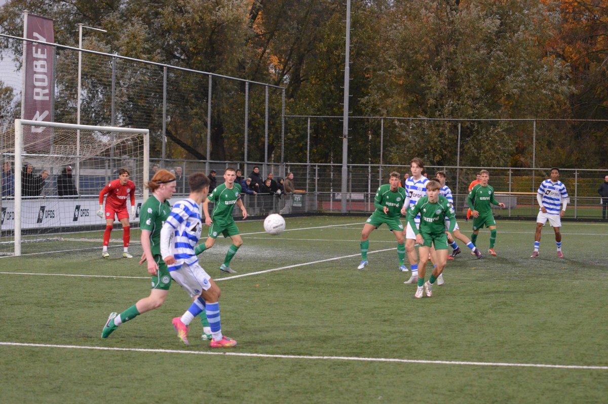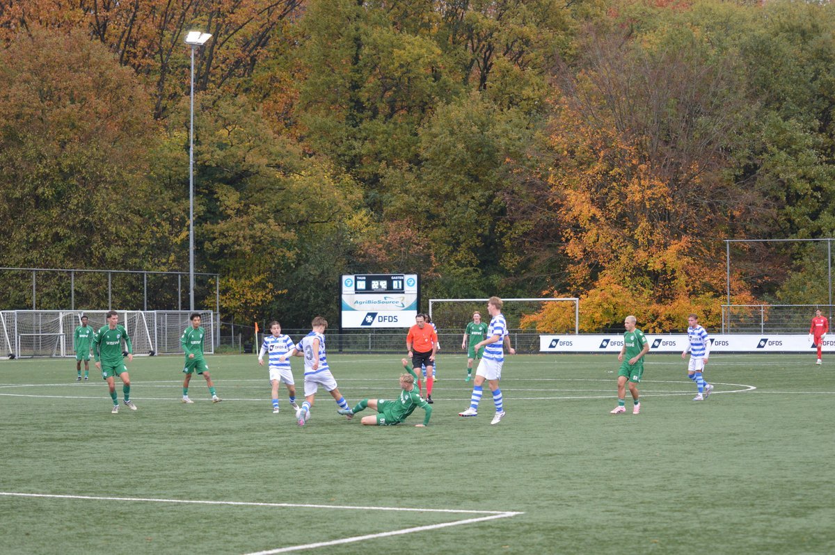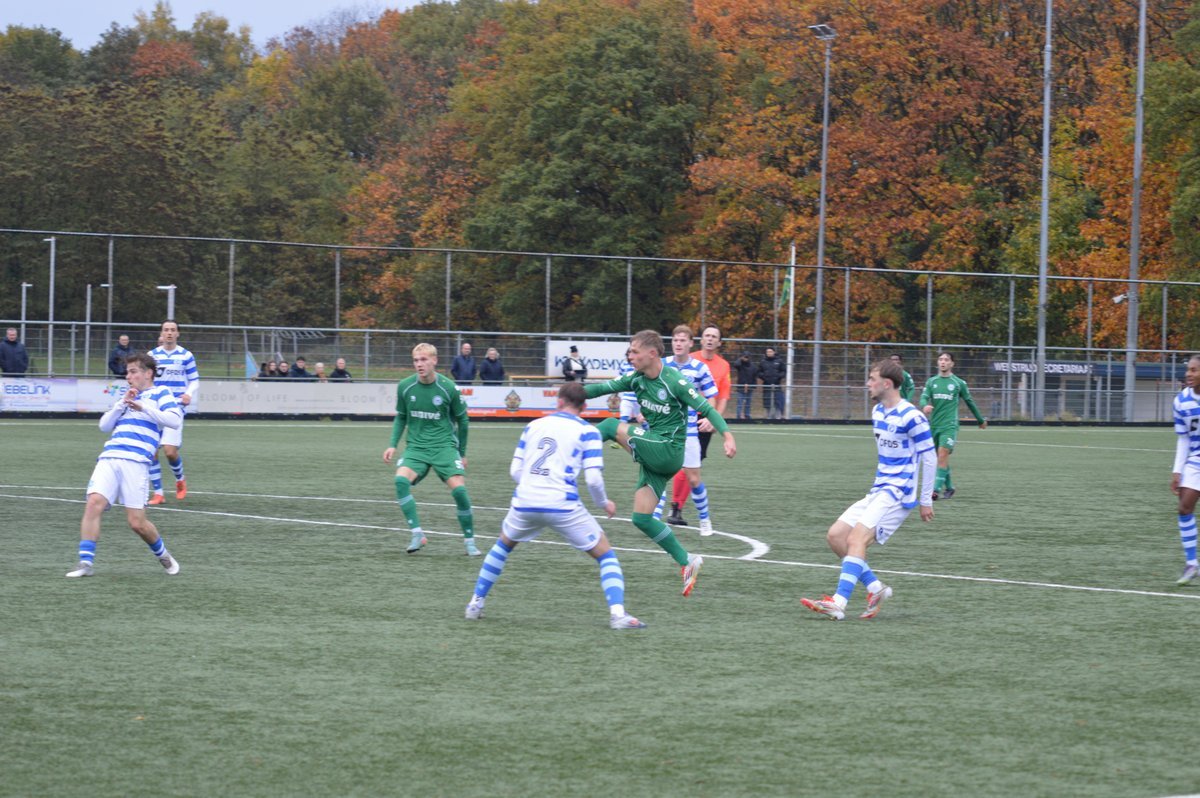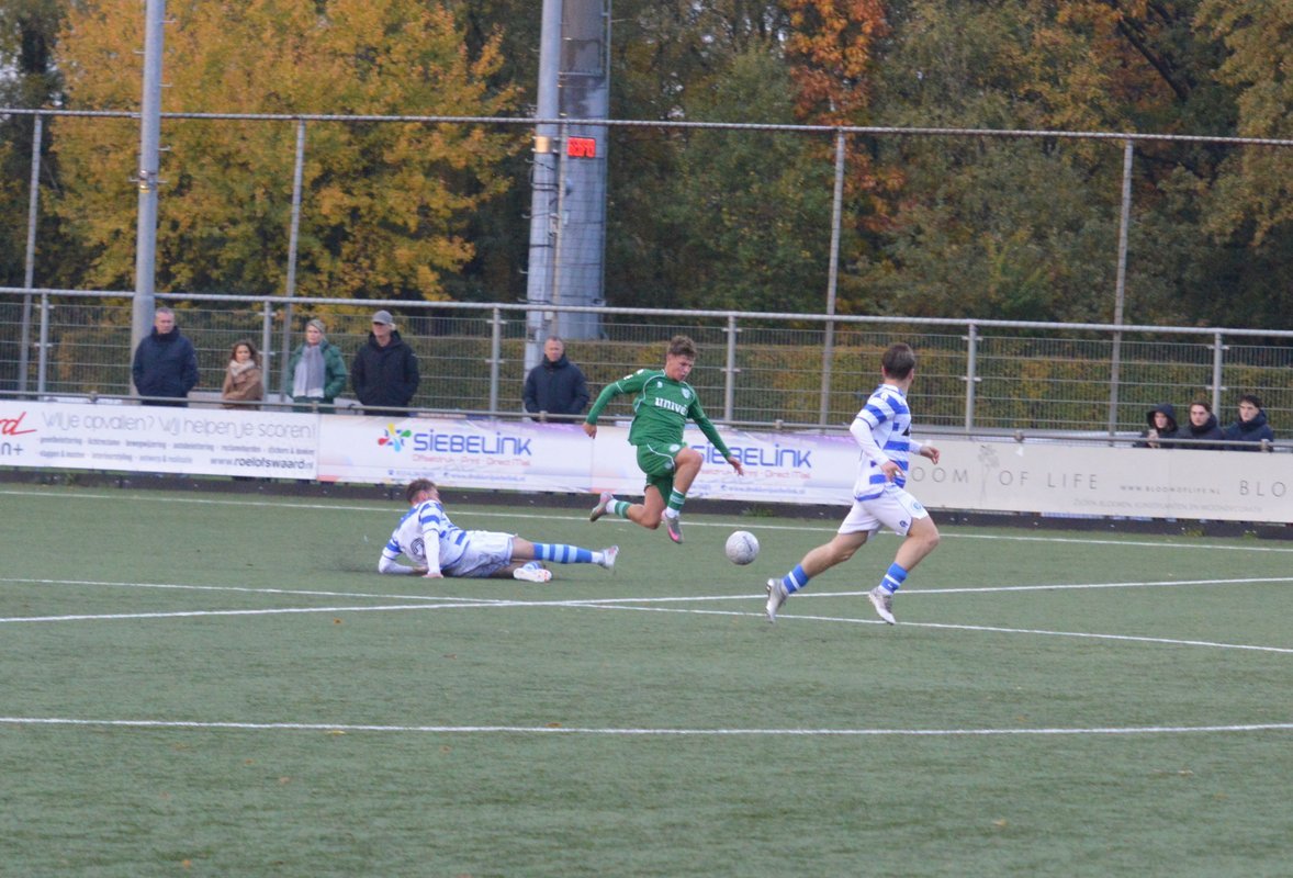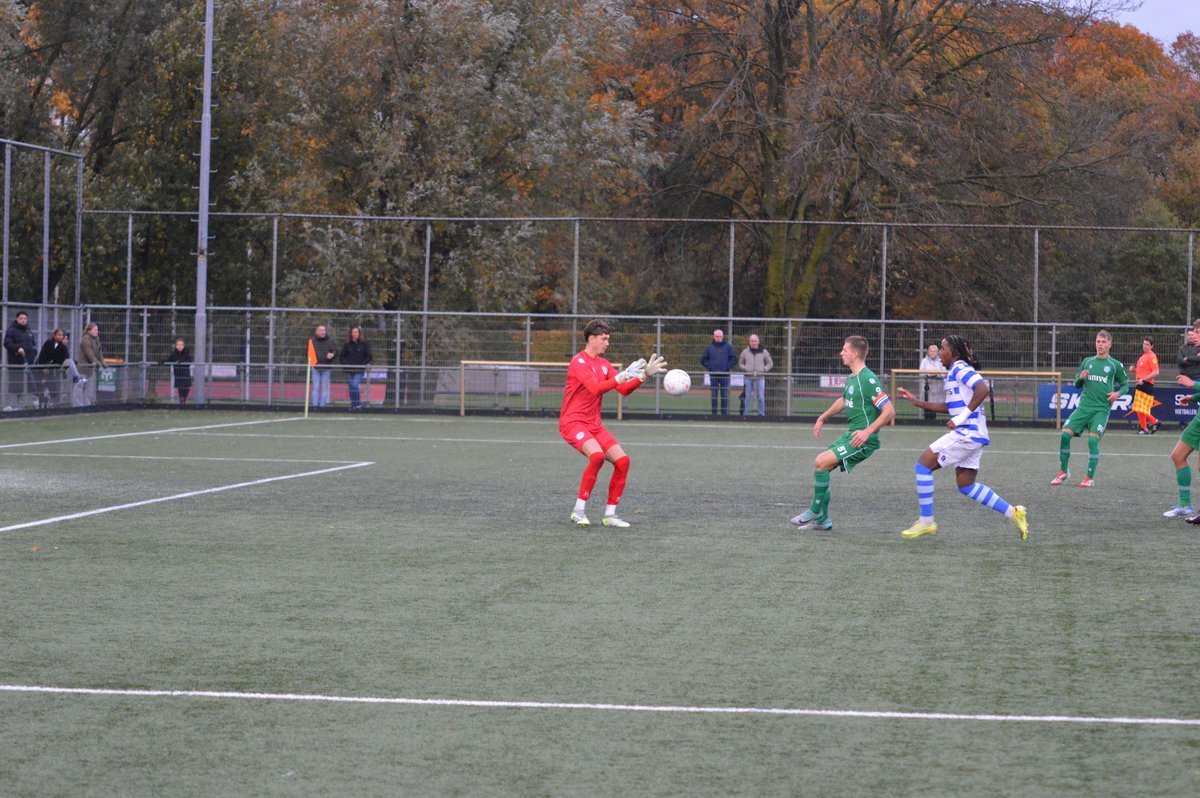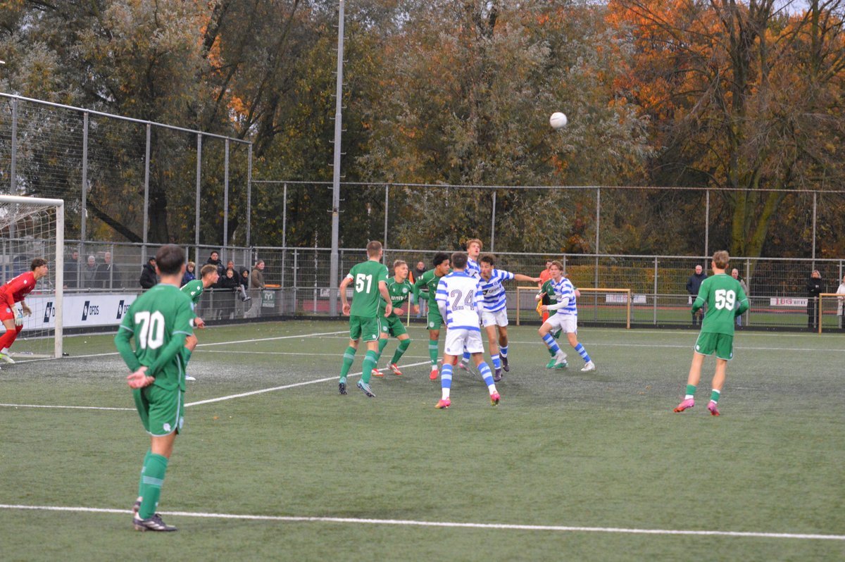 In de 66ste minuut maakte Benjamin Mambo de 1-3 en de thuisploeg ging vol op jacht naar meer. Als in de 70ste minuut dan ook nog Jermain Fernandes nog de 2-3 maakt weet je dat het alle hens aan dek is voor FC Groningen. Via Jari Kolthof en Levi Roeland kregen de Groningers nog kansen om de wedstrijd definitief in het slot te gooien maar beiden faalden oog in oog met de doelman en eigenlijk had de thuisploeg wel een strafschop verdiend in de laatste fase maar de in de tweede helft een zeer warrig fluitende scheidsrechter gaf die niet en daar mochten FC Groningen niet over klagen. Met kunst en vliegwerk soms bleven de mannen overeind en zo bleef het bij de 2-3 en nam FC Groningen qua veldspel wel de winst verdiend mee terug en als men dan ook nog hoort dan concurrent SC Cambuur met 5-4 klop kreeg in Zwolle kon de middag helemaal niet meer stuk. Door die nederlaag neemt FC Groningen de koppositie weer over en heeft nog een inhaalwedstrijd tegoed zelfs. Die wordt gespeeld op dinsdag 18 november op Corpus den Hoorn tegen PEC Zwolle.