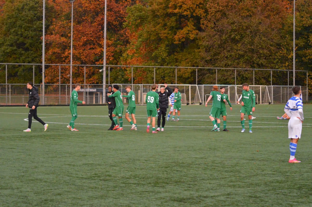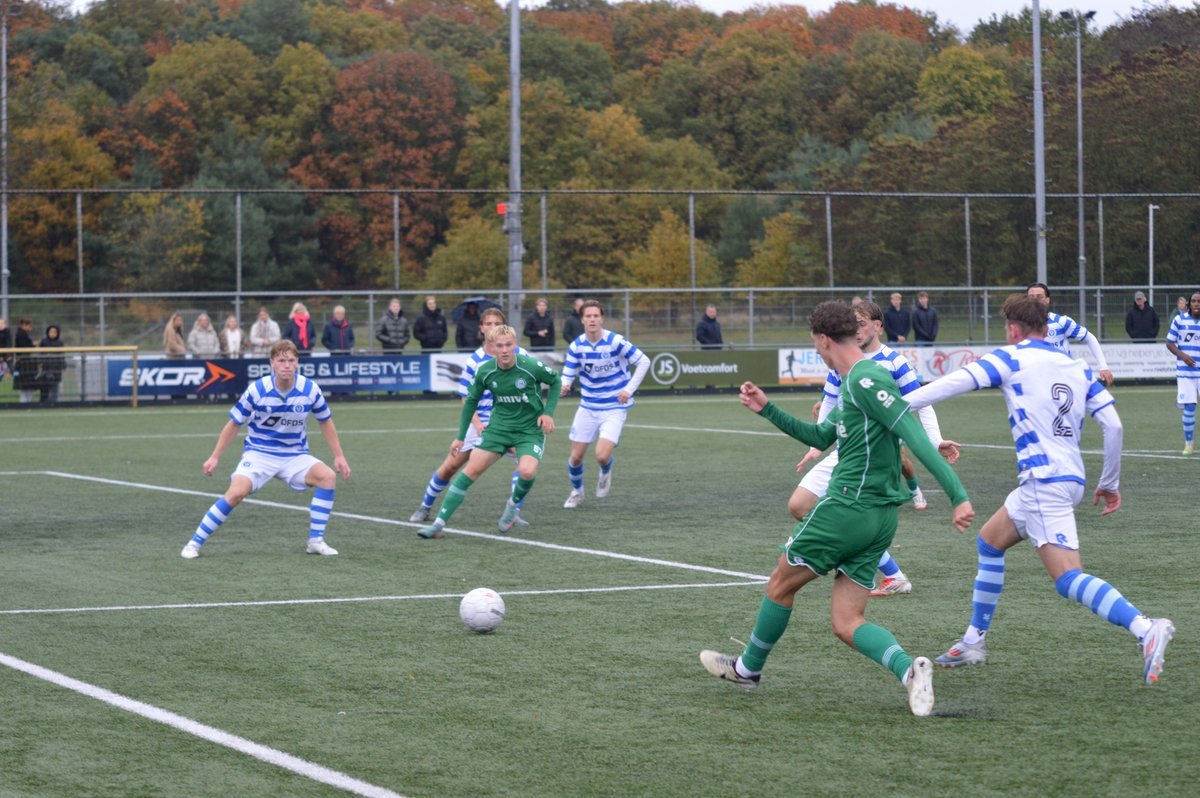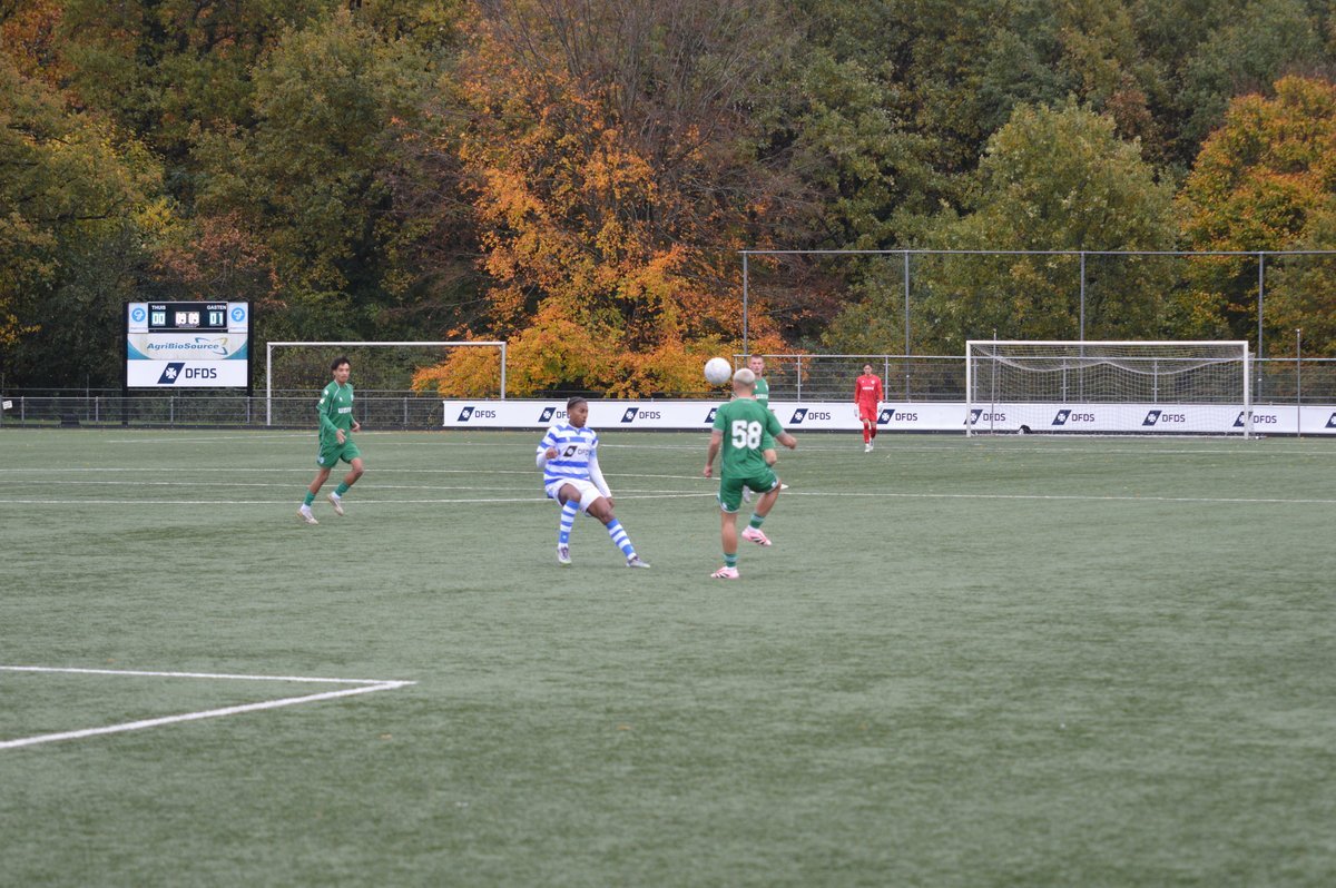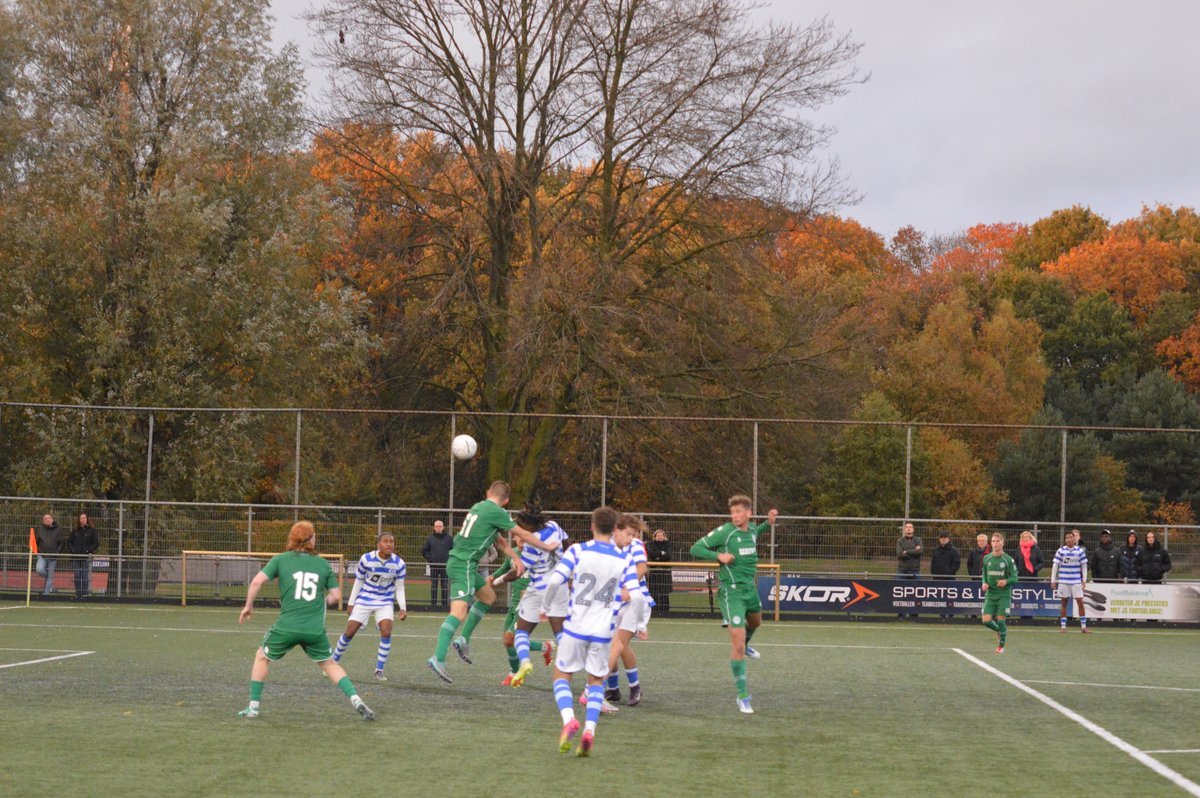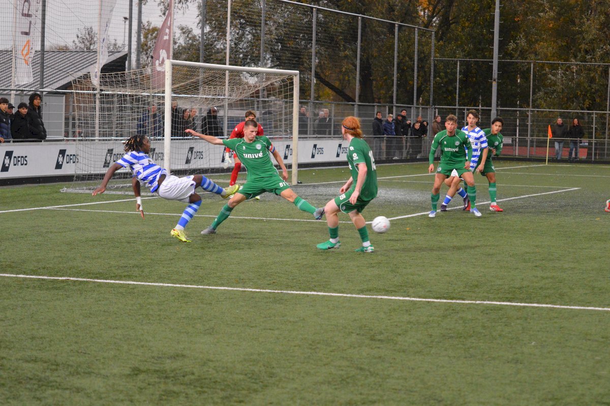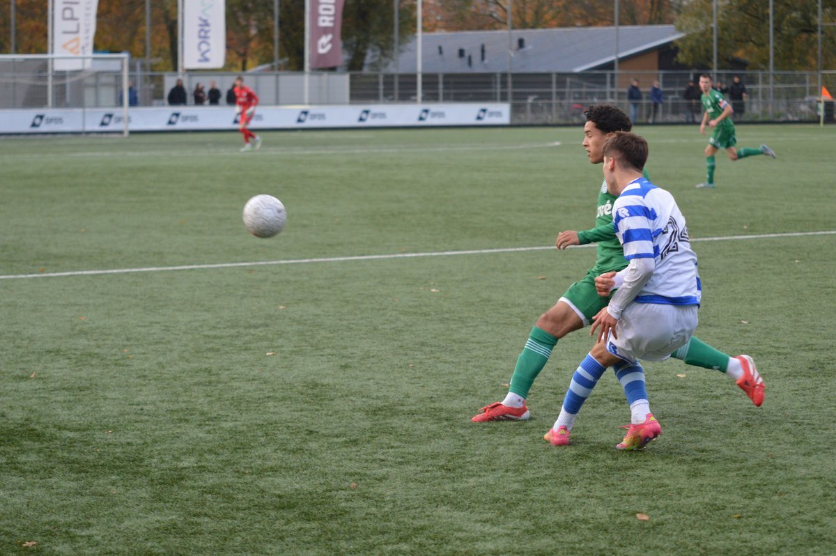 In de 66ste minuut maakte Benjamin Mambo de 1-3 en de thuisploeg ging vol op jacht naar meer. Als in de 70ste minuut dan ook nog Jermain Fernandes nog de 2-3 maakt weet je dat het alle hens aan dek is voor FC Groningen. Via Jari Kolthof en Levi Roeland kregen de Groningers nog kansen om de wedstrijd definitief in het slot te gooien maar beiden faalden oog in oog met de doelman en eigenlijk had de thuisploeg wel een strafschop verdiend in de laatste fase maar de in de tweede helft een zeer warrig fluitende scheidsrechter gaf die niet en daar mochten FC Groningen niet over klagen. Met kunst en vliegwerk soms bleven de mannen overeind en zo bleef het bij de 2-3 en nam FC Groningen qua veldspel wel de winst verdiend mee terug en als men dan ook nog hoort dan concurrent SC Cambuur met 5-4 klop kreeg in Zwolle kon de middag helemaal niet meer stuk. Door die nederlaag neemt FC Groningen de koppositie weer over en heeft nog een inhaalwedstrijd tegoed zelfs. Die wordt gespeeld op dinsdag 18 november op Corpus den Hoorn tegen PEC Zwolle.