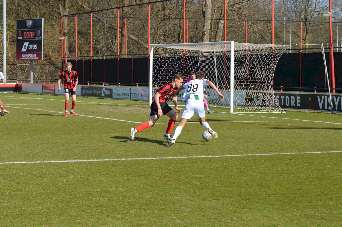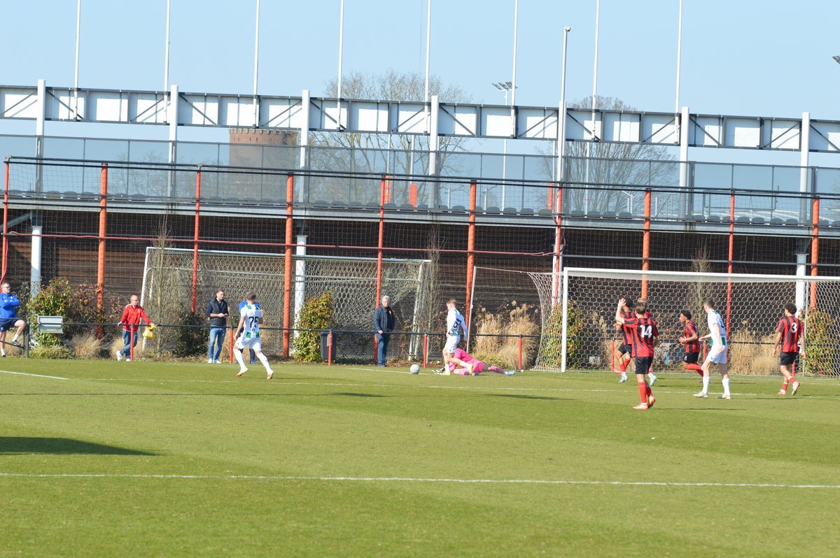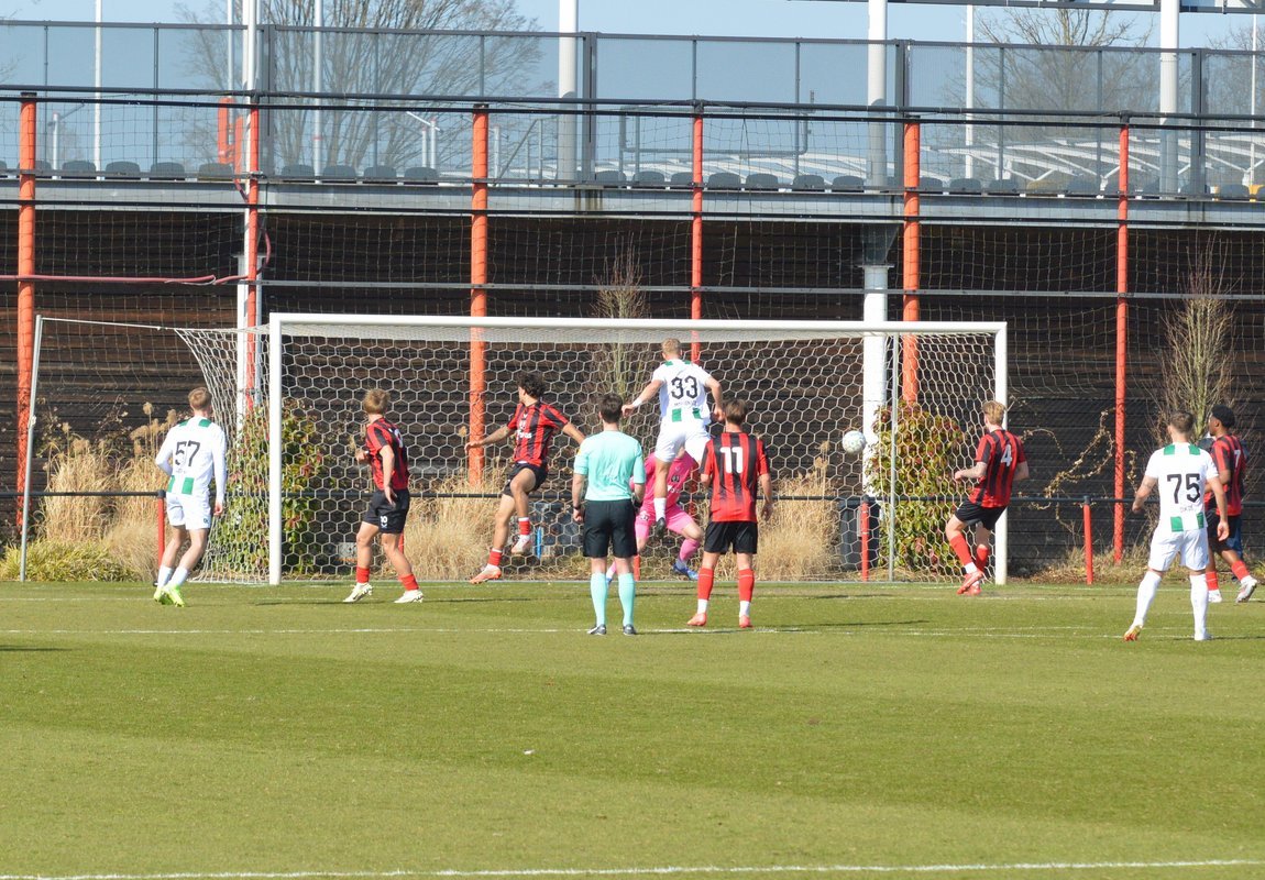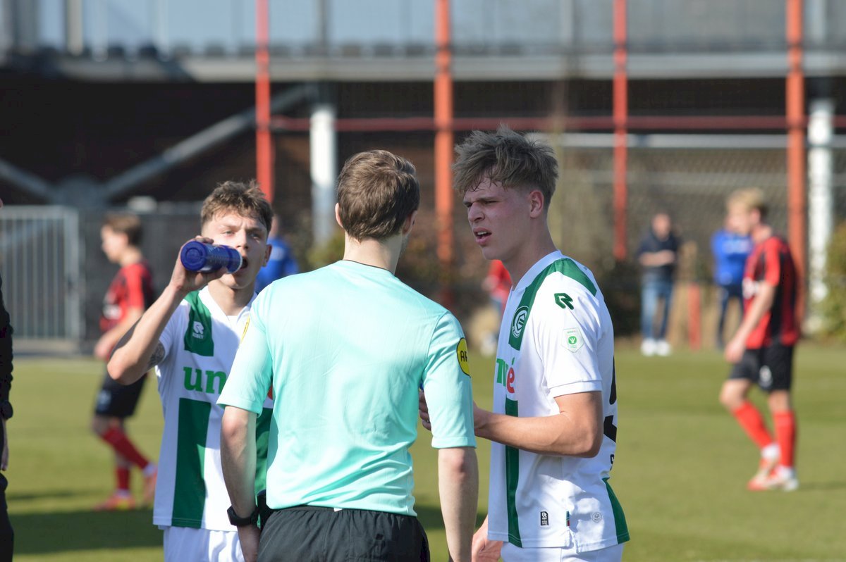 Vanaf het begin van de wedstrijd nam FC Groningen het initiatief in de wedstrijd en met snel en gevarieerd voetbal werd de verdediging van FC Twnete/Heracles terug gedrongen. In de negende minuut de eerste grote kans voor FC Groningen als een foute terugspeelbal van de thuisploeg goed word in geschat door Nils Eggens en die komt er tussen maar de man die garant staat voor doelpunten mist nu en schiet tegen de keeper op. Nils Eggens is het doelpunten maken een beetje krijt maar dat is logisch op die leeftijd, dat komt echt wel weer. Een paar minuten later krijgt Alex Mortensen een grote kans als hij vrij voor doelman Sam Karssies komt maar schiet dan tegen de doelman aan en in de rebound word een inzet van Roy Leicester van de lijn gehaald en direct daarna is het dan David van de Werff die via de binnenkant van de paal de 0-1 binnen knalt. Een dik verdiende voorsprong voor een veel beter FC Groningen.