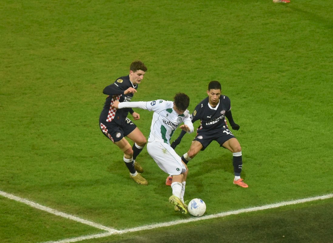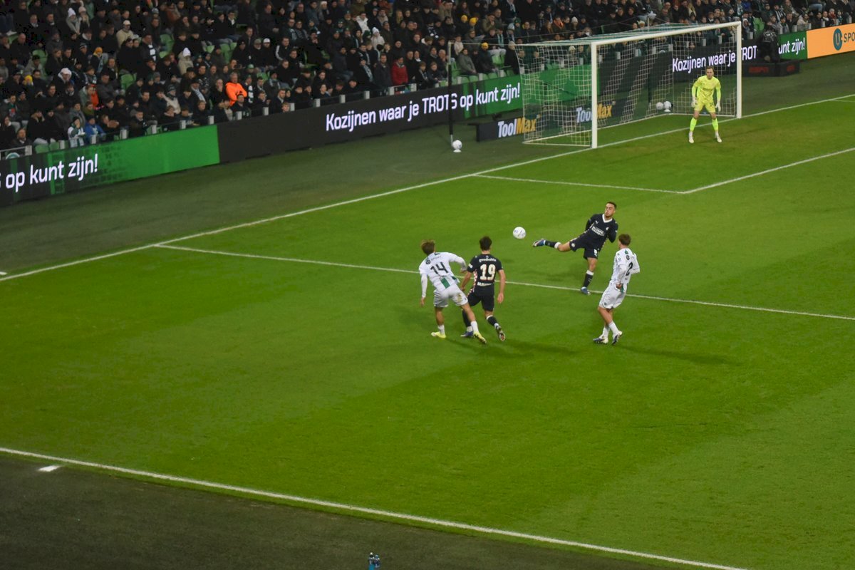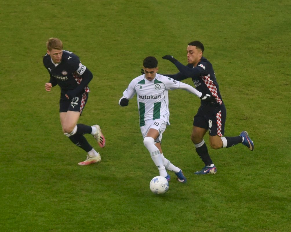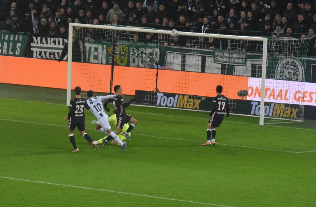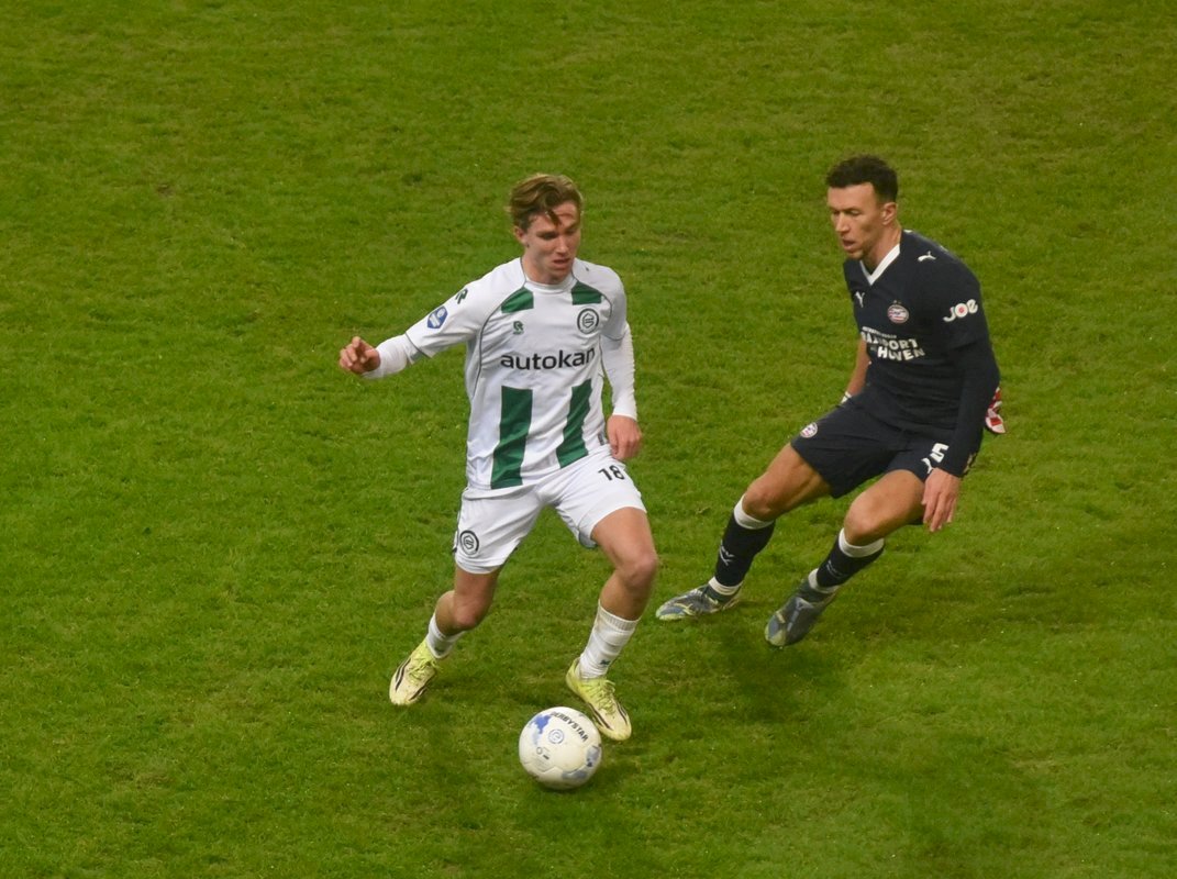 Taha kreeg na 35 minuten spelen een uitstekende mogelijkheid om zijn tweede van de middag te scoren. De inventeur snelde ervandoor en slaagde er opnieuw in om op Schiks af te snellen. Deze keer was de stift niet voldoende hoog, waardoor de doelman redding bood. Natuurlijk kwam ook PSV meerdere keren gevaarlijk voor het doel van Etienne Vaessen. Paul Wanner schoot op de binnenkant van de paal, waardoor de bal gevaarlijk aan de linkerzijde van de doellijn bleef rollen. Vaessen zorgde later in de wedstrijd voor een indrukwekkende redding op een inzet van Ismael Saibari. De FC streed naar de rust, gesteund door een fanatiek en gepassioneerd Euroborg.