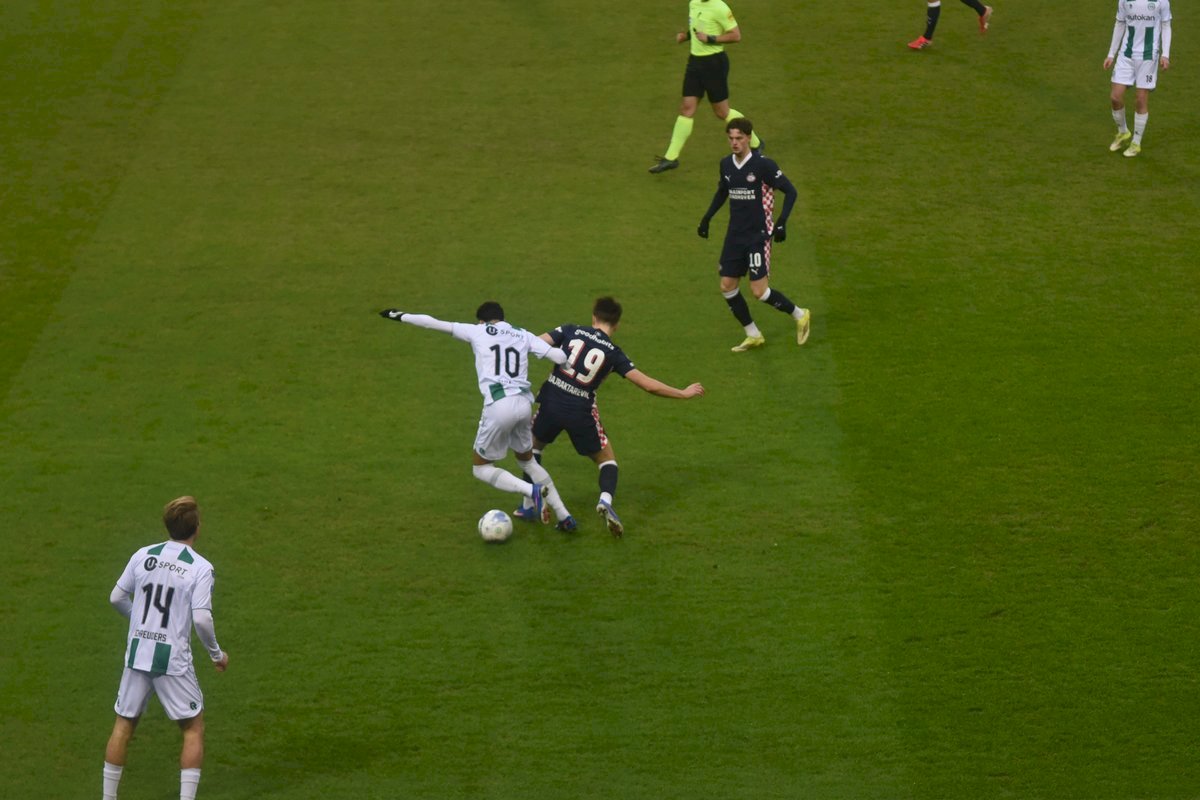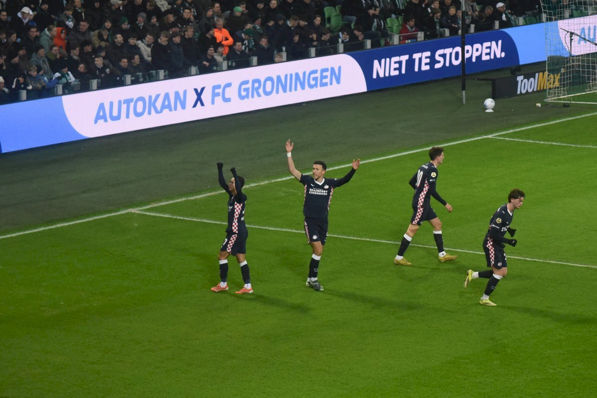 Hoewel FC Groningen qua strijd en energie zeker niet onder deed voor PSV en ook durfde vooruit te gaan om een doelpunt te scoren, moest het team na 65 minuten toch een tegengoal incasseren. Uit een voorzet van Mauro Junior slaagde er in Ismael Saibari geheel vrijstaand de 1-1 te scoren. Een onoplettendheid in de Groningse defensie. De FC bleef volle bak doorstrijden op zoek naar een tweede doelpunt.