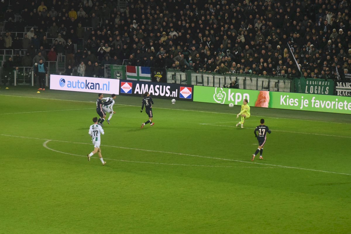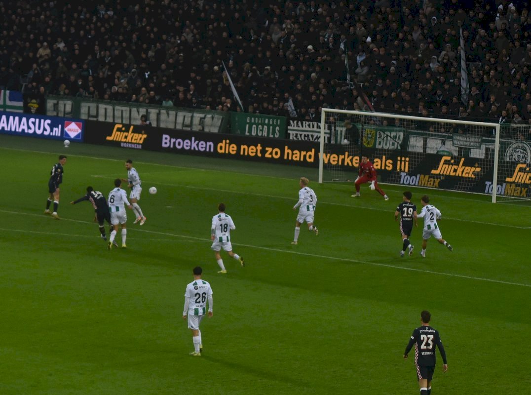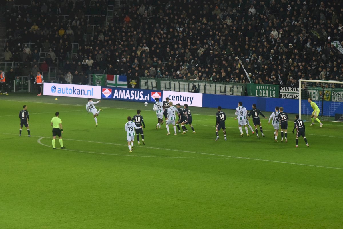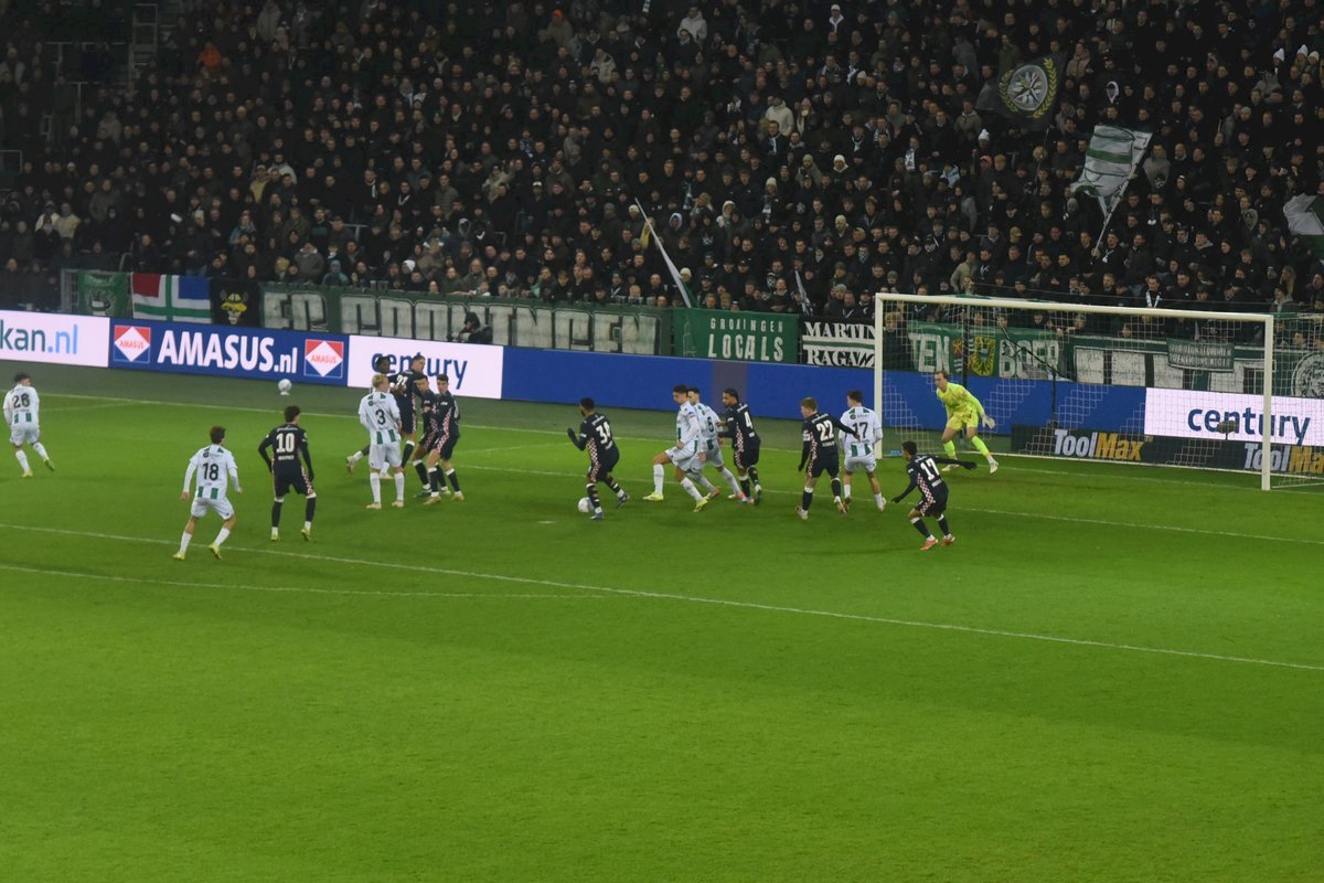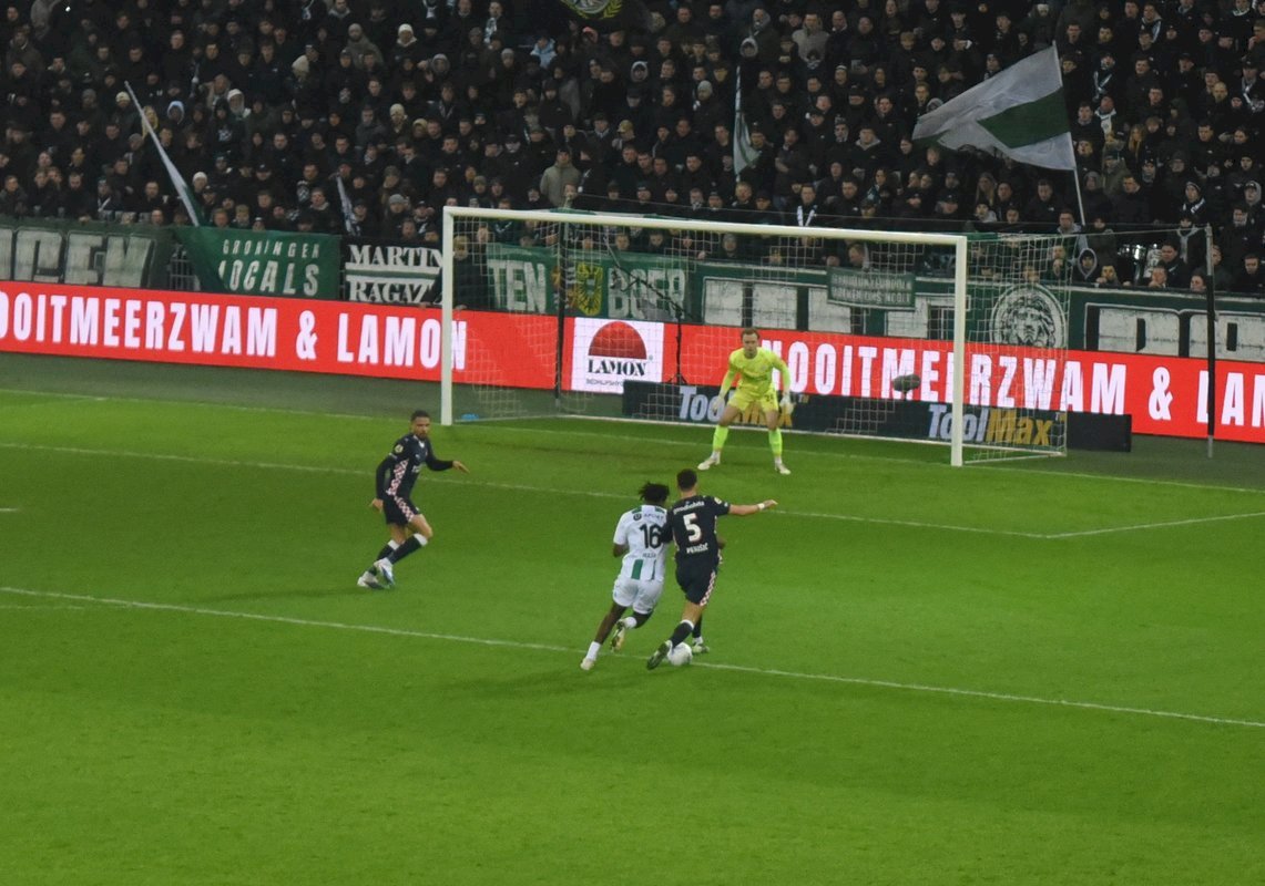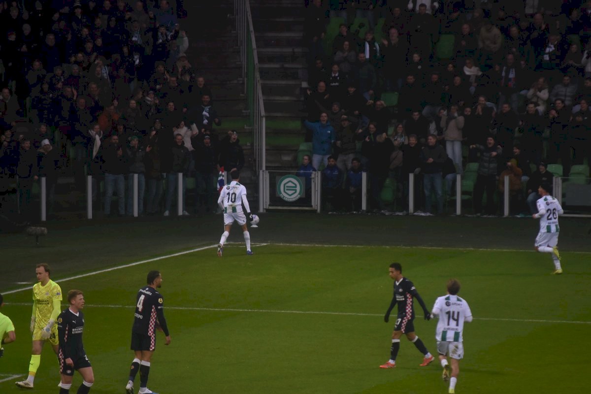 Op de late zondagmiddag speelde FC Groningen tegen aanstaande landskampioen PSV en verloor onterecht met 1-2. De manier waarop FC Groningen deze wedstrijd verloor roept vraagtekens op want de hoekschop waaruit die 1-2 werd gescoord had nooit toegekend mogen worden want de bal lag duidelijk ver buiten het vak (zie foto hieronder) waar de hoekschop genomen moet worden. Een zure manier van verliezen en laten we het er maar ‘geluk van de landskampioen’ houden. Toch speelde FC Groningen een prima wedstrijd en had echt meer verdiend dan een nederlaag. De 17-jarige Ryan Metu, afkomstig uit de Opleiding, debuteerde als invaller voor de FC.