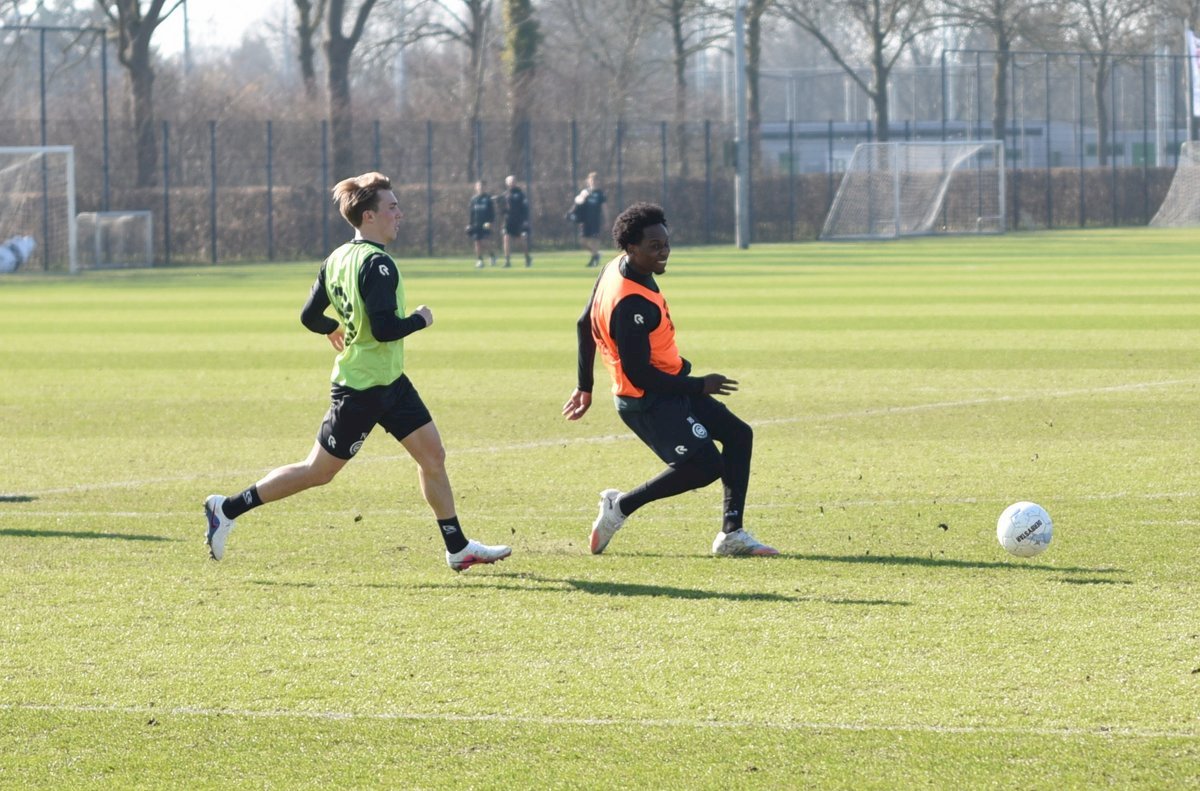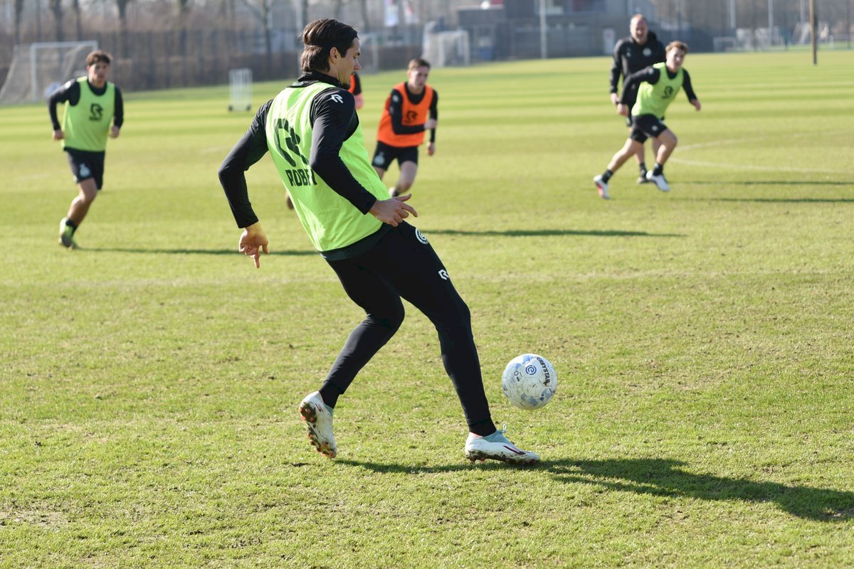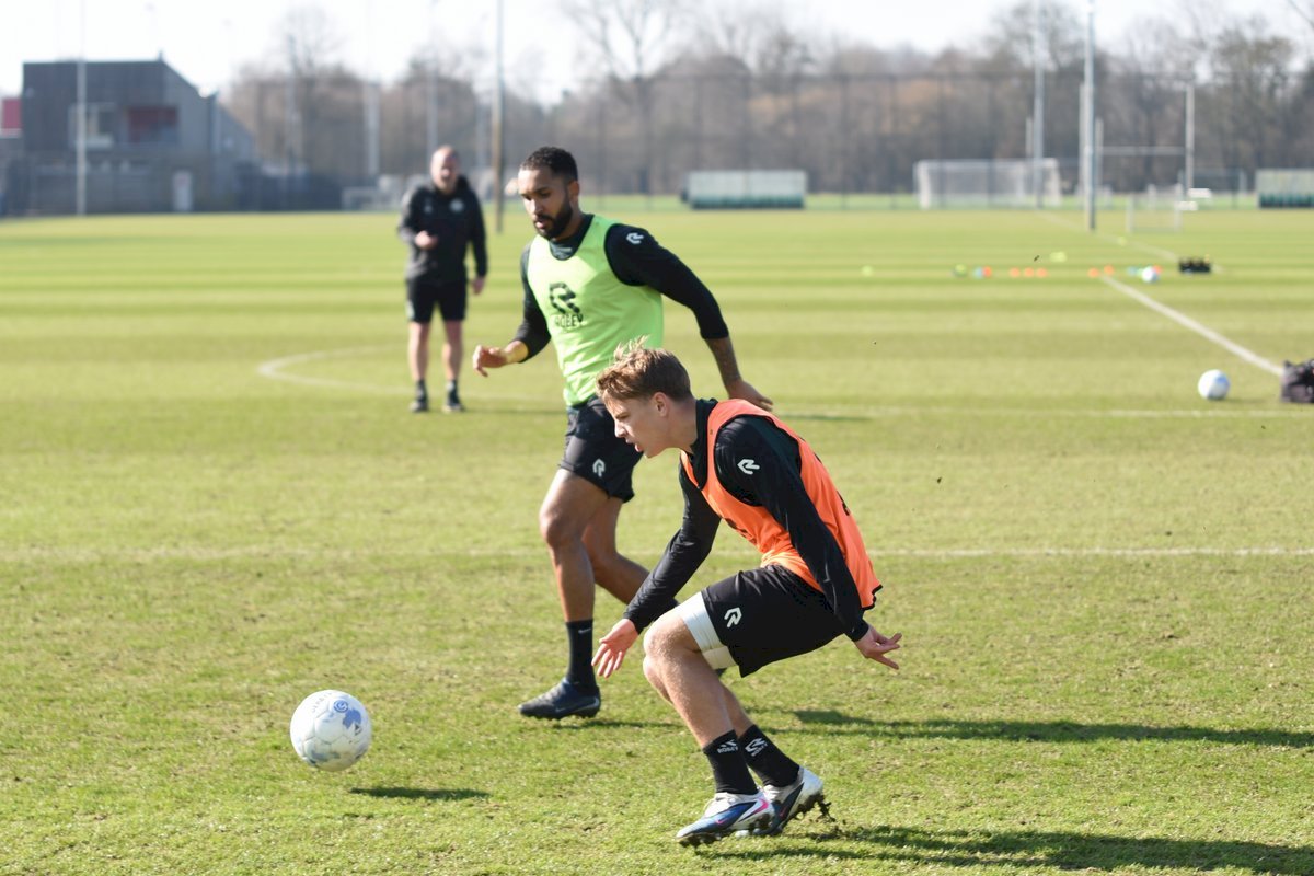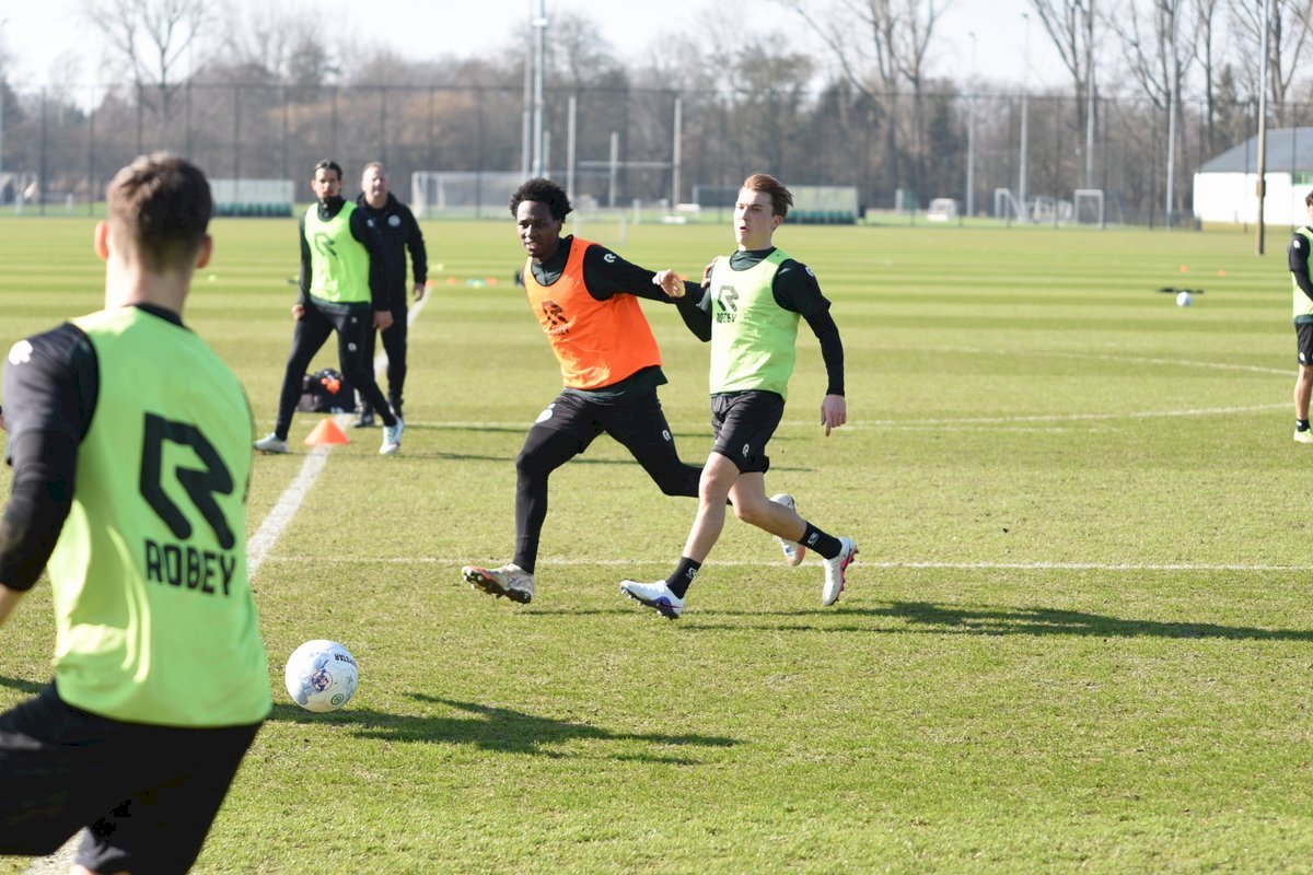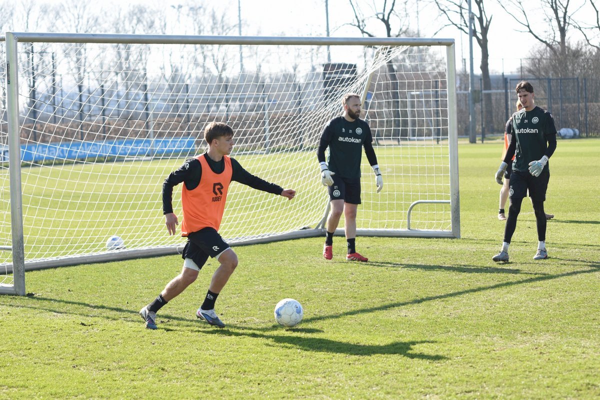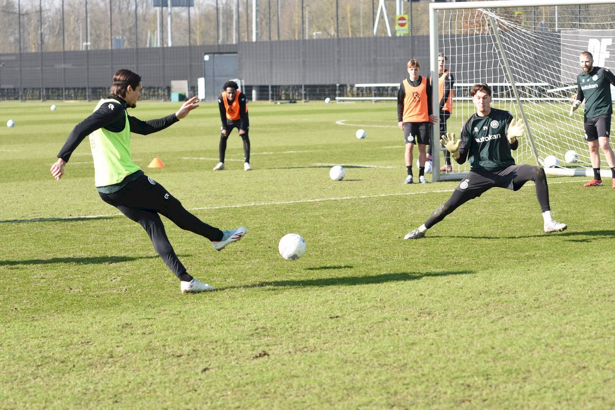 Vanmorgen trainde de eerste selectie van FC Groningen in aanloop naar de wedstrijd tegen de recordkampioen Ajax van zaterdagmiddag 16.30 uur. Een wedstrijd die eigenlijk gewonnen moet worden want anders staat de teller op zeven wedstrijd zonder zege en dat wil je niet graag. Dan moet de FC het ook nog doen zonder hun zwaar geblesseerde aanvoerder Stije Resink en zonder de geschorste Younes Taha. Zoals de training vanmorgen uitwees is het mogelijk dat Dick Lukkien voor Travis Hernes kiest als vervanger van Younes Taha en uiteraard zoals verwacht Jorg Schreuders op de plek van Stije Resink. Hierbij een aantal foto’s van de training van hedenmorgen.