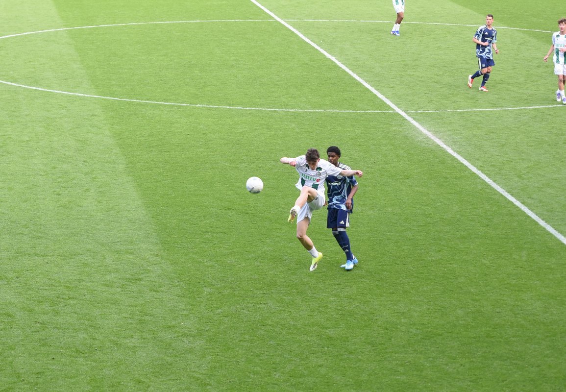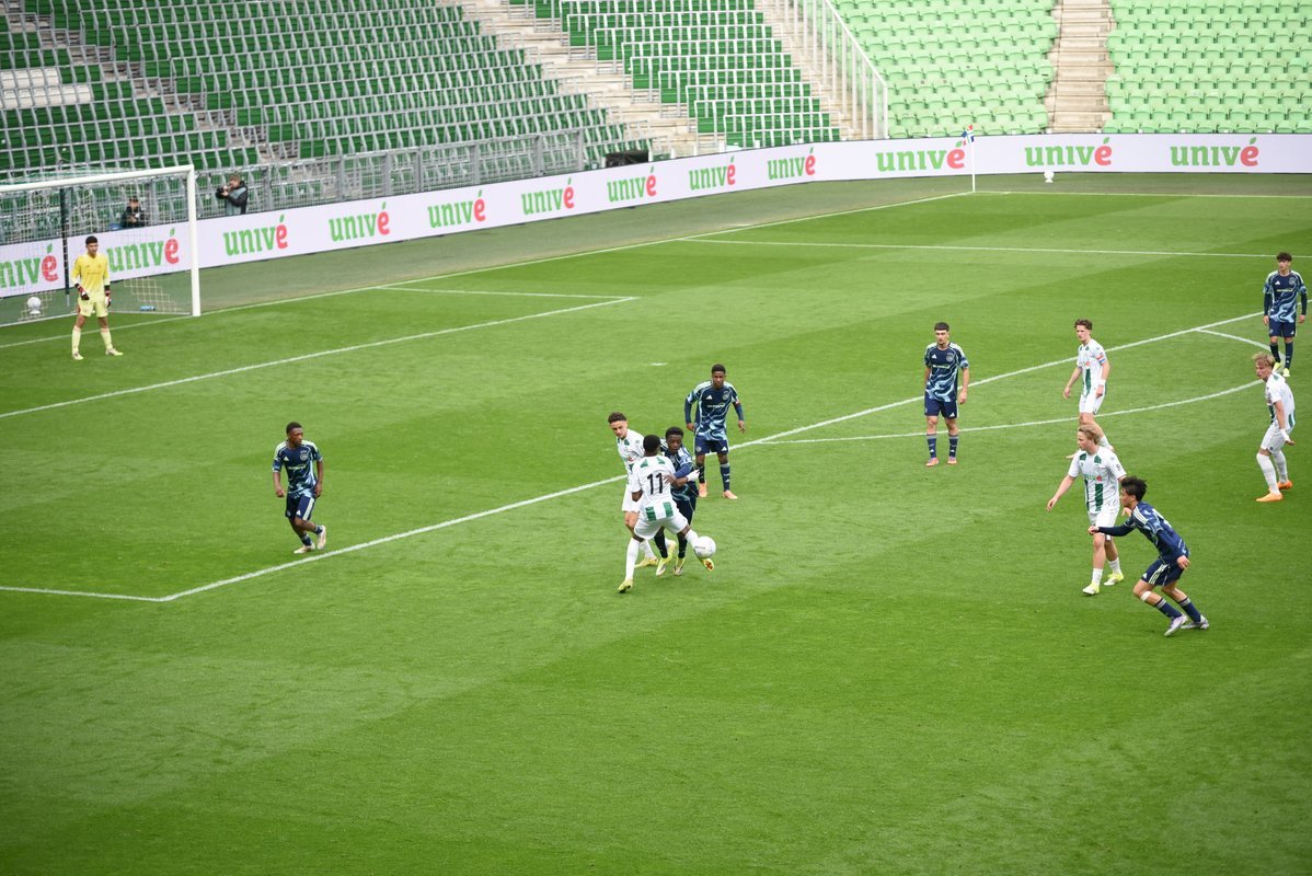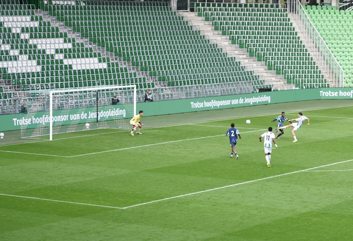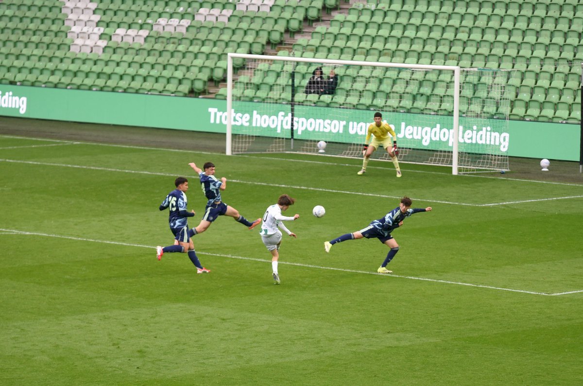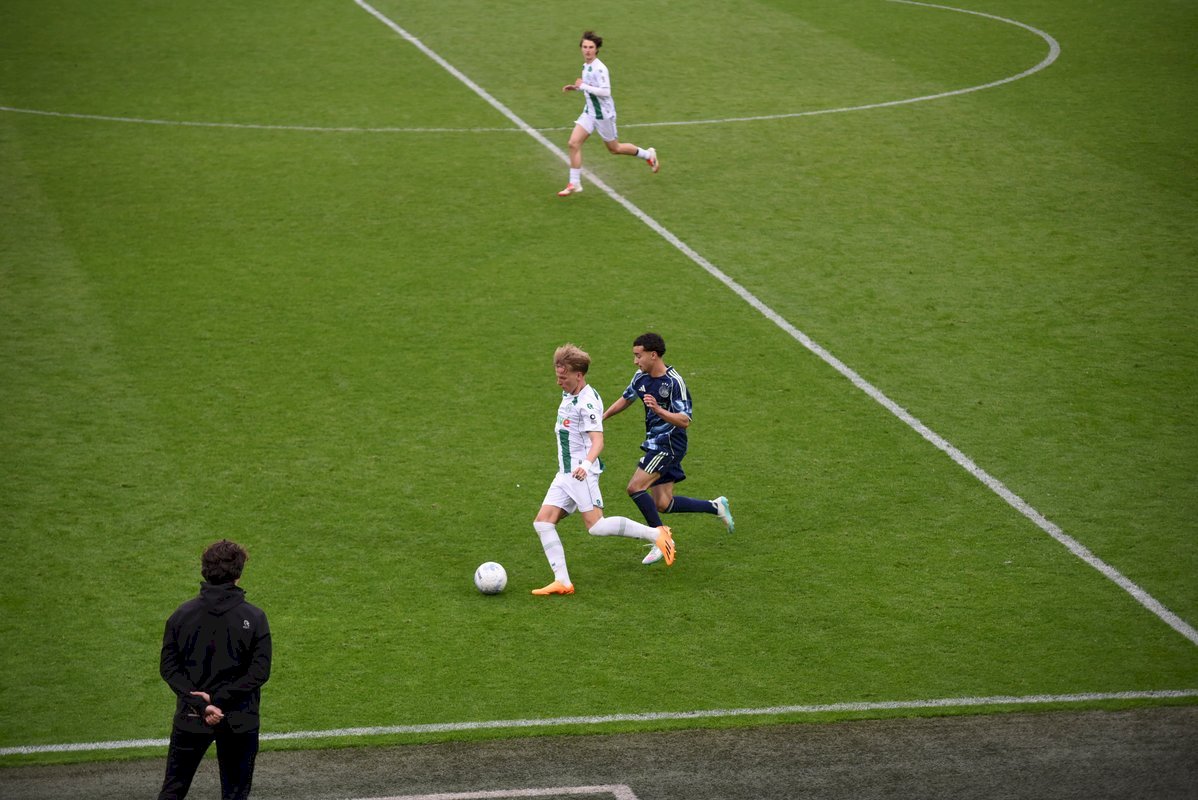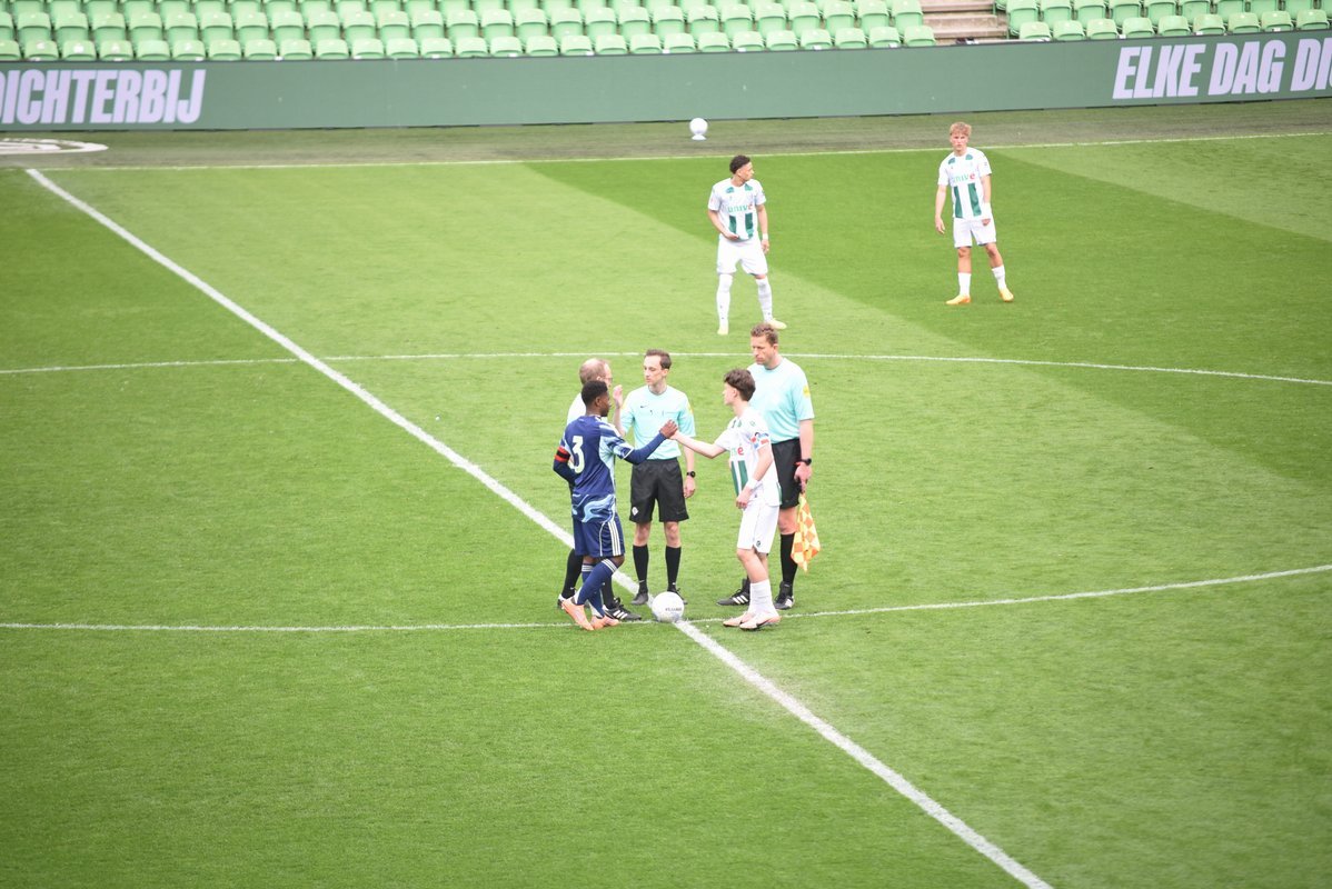 De wedstrijd ging in de eerste helft redelijk gelijk op al kon je zien dat de Ajaxieden wat behendiger, sneller en technischer zijn. In de 13e minuut kwam de ploeg dan ook op voorsprong door een goal van Xander Newstead. FC Groningen rechtte de rug en kwam drie minuten later via een prachtige vrije trap van Luc Kort op gelijke hoogte, 1-1.
