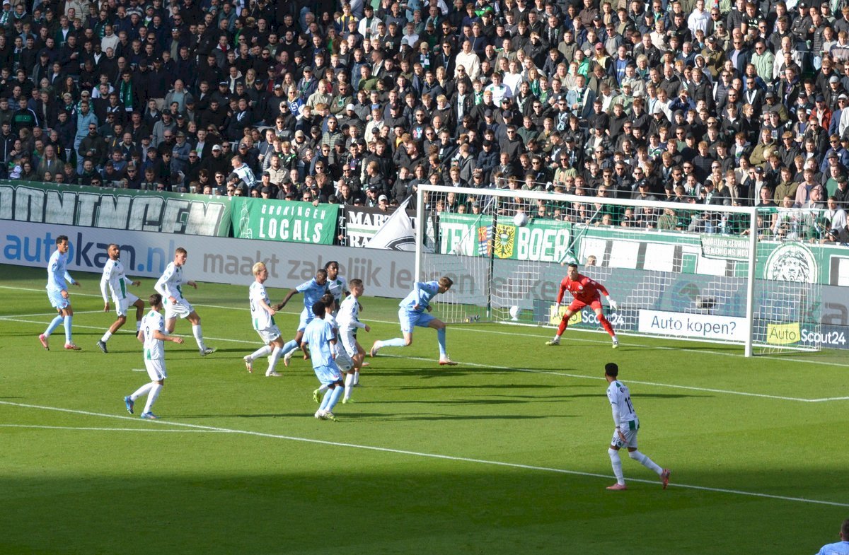 FC Groningen had het moeilijk in de eerste helft, hoewel de Trots van het Noorden het eerste gevaar creëerde. David van der Werff zag na vijf minuten spelen een voorzet met een carambole tegen de paal vallen. Vervolgens waren er kansen voor de bezoekers. Tobias Lauritsen kreeg een mogelijkheid, maar Thijmen Blokzijl was er op tijd bij om de aanvaller van scoren af te houden. Na dertig minuten kreeg de spits de volgende kans, maar Dies Janse slaagde er in om het schot te blokken. Na een foute terugspeelbal van Tika de Jonge kon redding worden gebracht en de gasten scoorden ui de daarop gegeven hoekschop. Tobias Lauritsen kwam voor zijn man Stije Resink en kopte de 0-1 binnen. De vraag is, waarom staat Resink bij de lange Lauritsen en niet de even lange Dies Janse. Uit de volgende hoekschop was het gelukt voor Lauritsen.