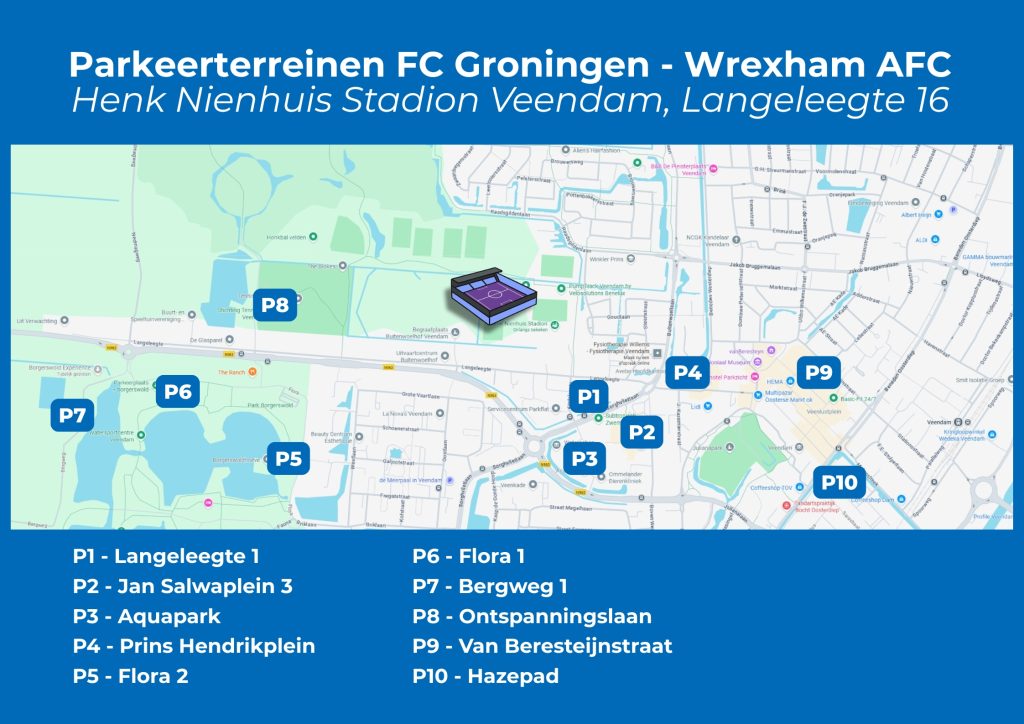 De gemeente Veendam heeft 10 parkeerterreinen met beperkte capaciteit gereed voor supporters die toch genoodzaakt zijn met de auto de wedstrijd te bezoeken. Kom je met de auto, probeer dan zoveel mogelijk (het laatste stuk) met elkaar mee te rijden.